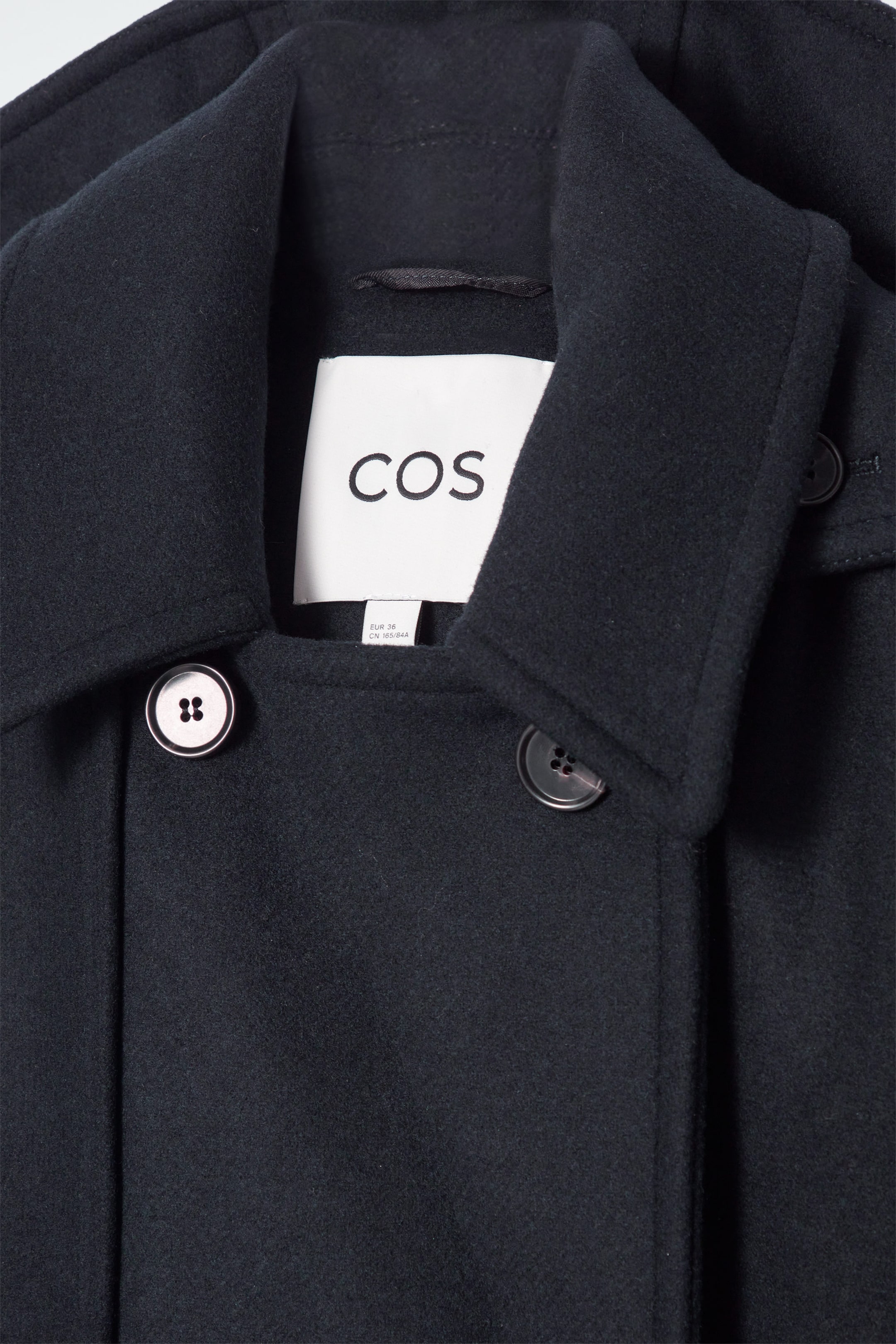 The COS duffle coat is underscored by a refined sensibility. It comes in a perennial navy shade and is designed with a pointed collar, double-breasted fold and storm flap that borrow from the classic trench. The recycled wool-blend fabric offers warmth in cooler weather, as do the enveloping hood and adjustable cuff tabs.