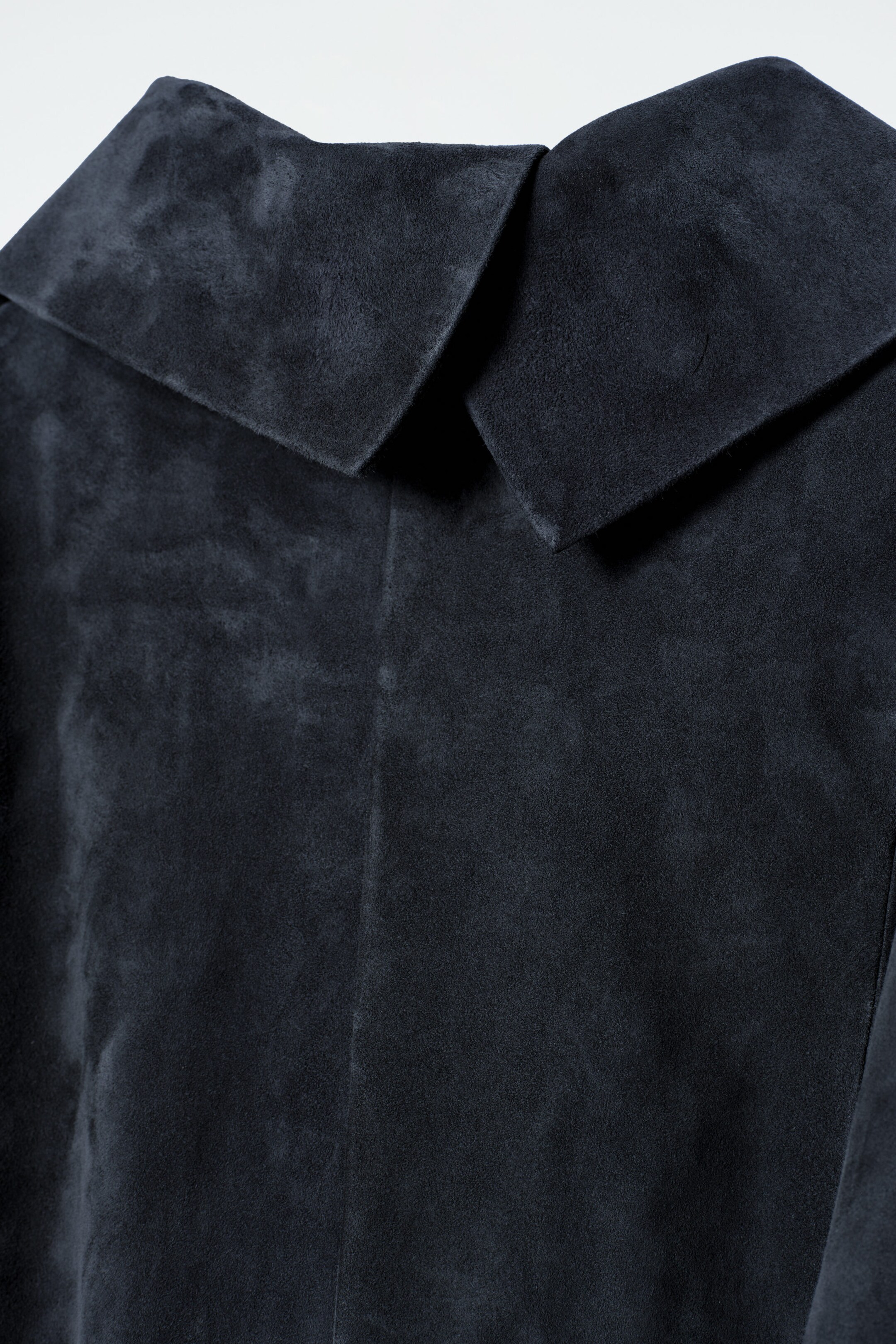 The COS SS25 runway collection builds on the house codes of lasting design and exceptional craftsmanship. Blending understated utility with a modern view on Renaissance, this half-zip blouson jacket is cut in a billowing shape with silver-tone metal accents and an elongated vent at the back. It’s made from luxuriously soft chrome-free suede that's tanned a deep anthracite tone, pulling focus to the hide's rich texture.