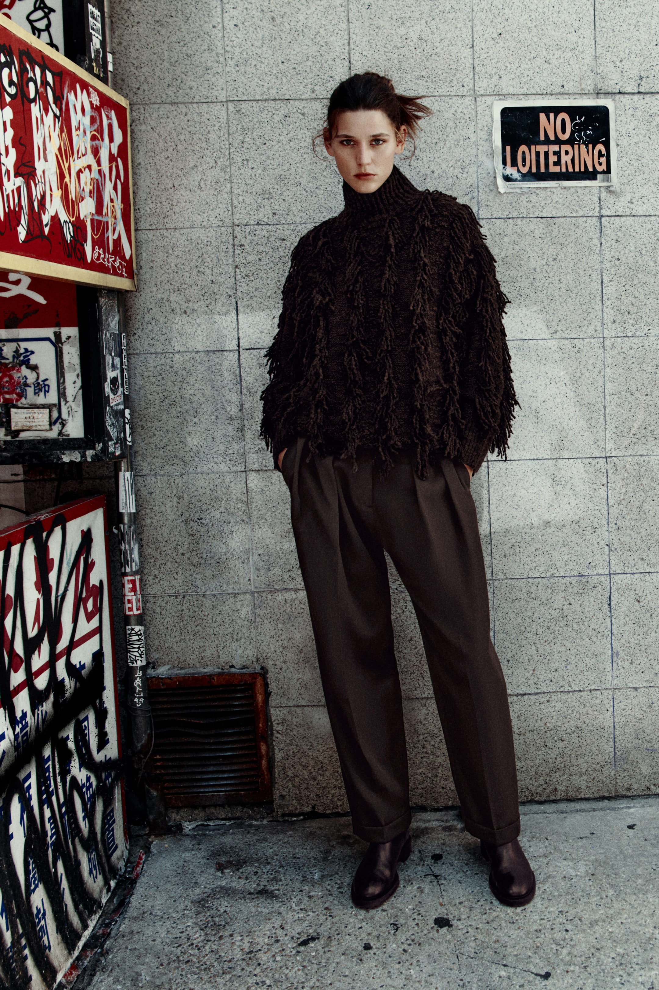 Colour and texture lend a fresh perspective to COS knitwear this season. Knitted from a warm RWS wool blend, this turtleneck jumper has a black and chocolate mélange finish, dimensional fringing and ribbed trims.