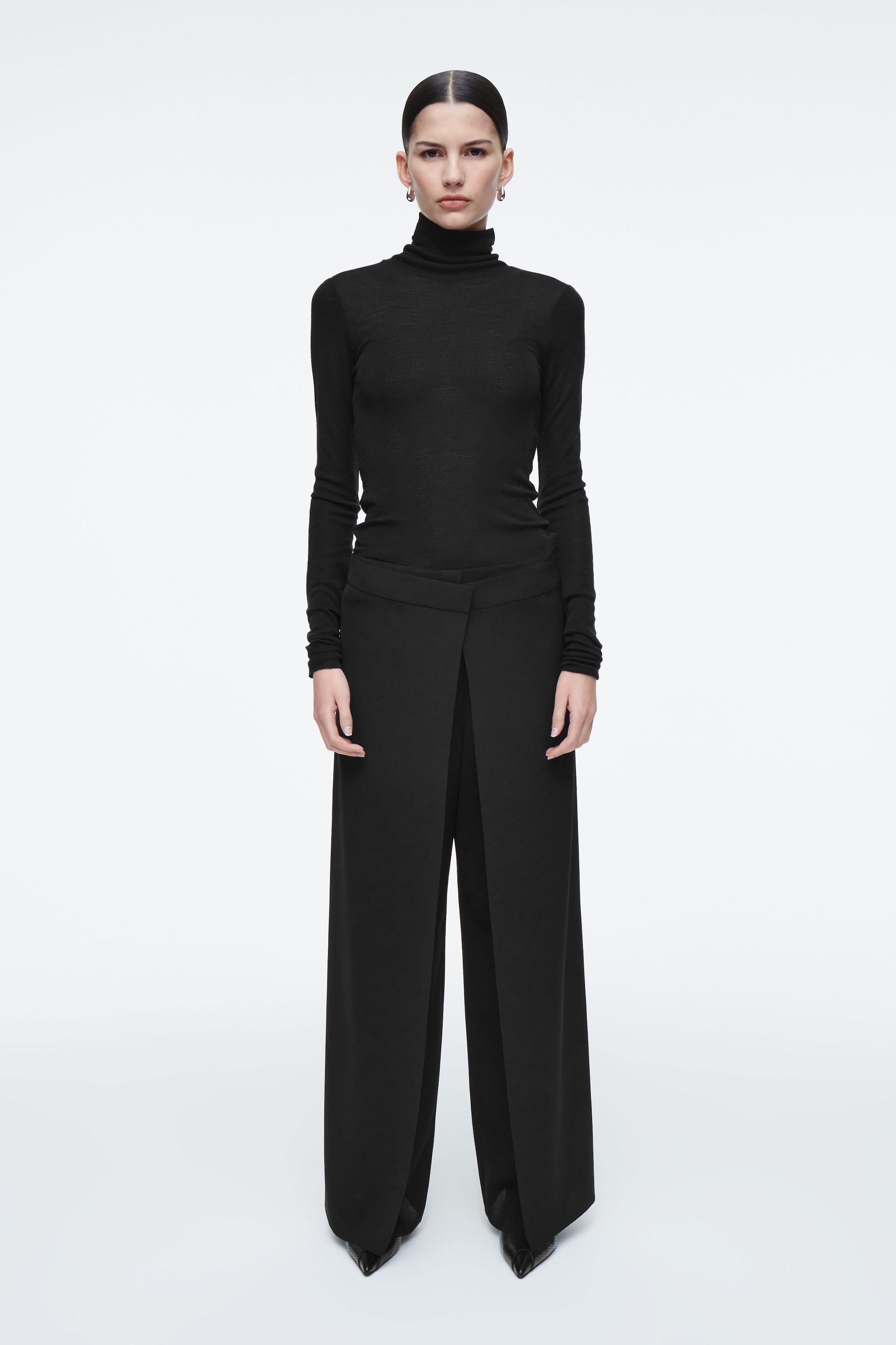 The COS womenswear team experiment with layering for Autumn Winter 2024. These modern trousers are cut in a wrap-front silhouette that creates the illusion of a skirt styled over the top.