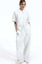 A key set in the new collection, the floral-jacquard short-sleeved shirt and trousers are woven with an understated motif that lends subtle pattern and texture, softening the utility-inspired shapes and pristine palette. Coordinating ballet flats add a polished feel.