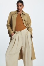 Meet the statement style of the season: the double-breasted trench, updated in soft cotton-corduroy in soft brown. Key details are exaggerated for a sense of flair — such as the elongated gun flap, the belted waist, the wide sleeve fastenings and the oversized lapels.