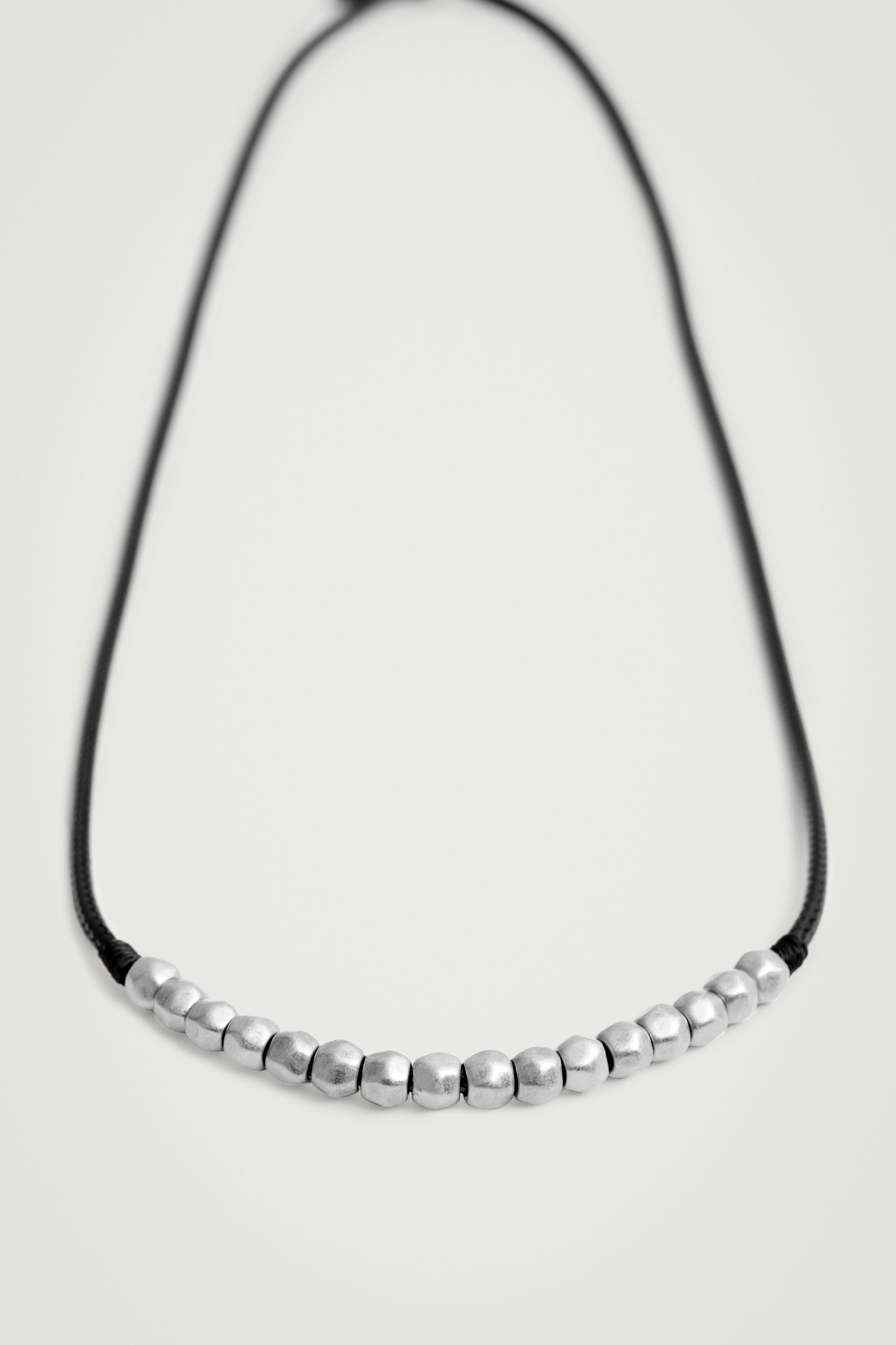 This modern cord necklace will charge even the simplest of outfits with personality. The braided rope is strung with a row of silver-tone beads that are brushed and hammered for a relaxed look.