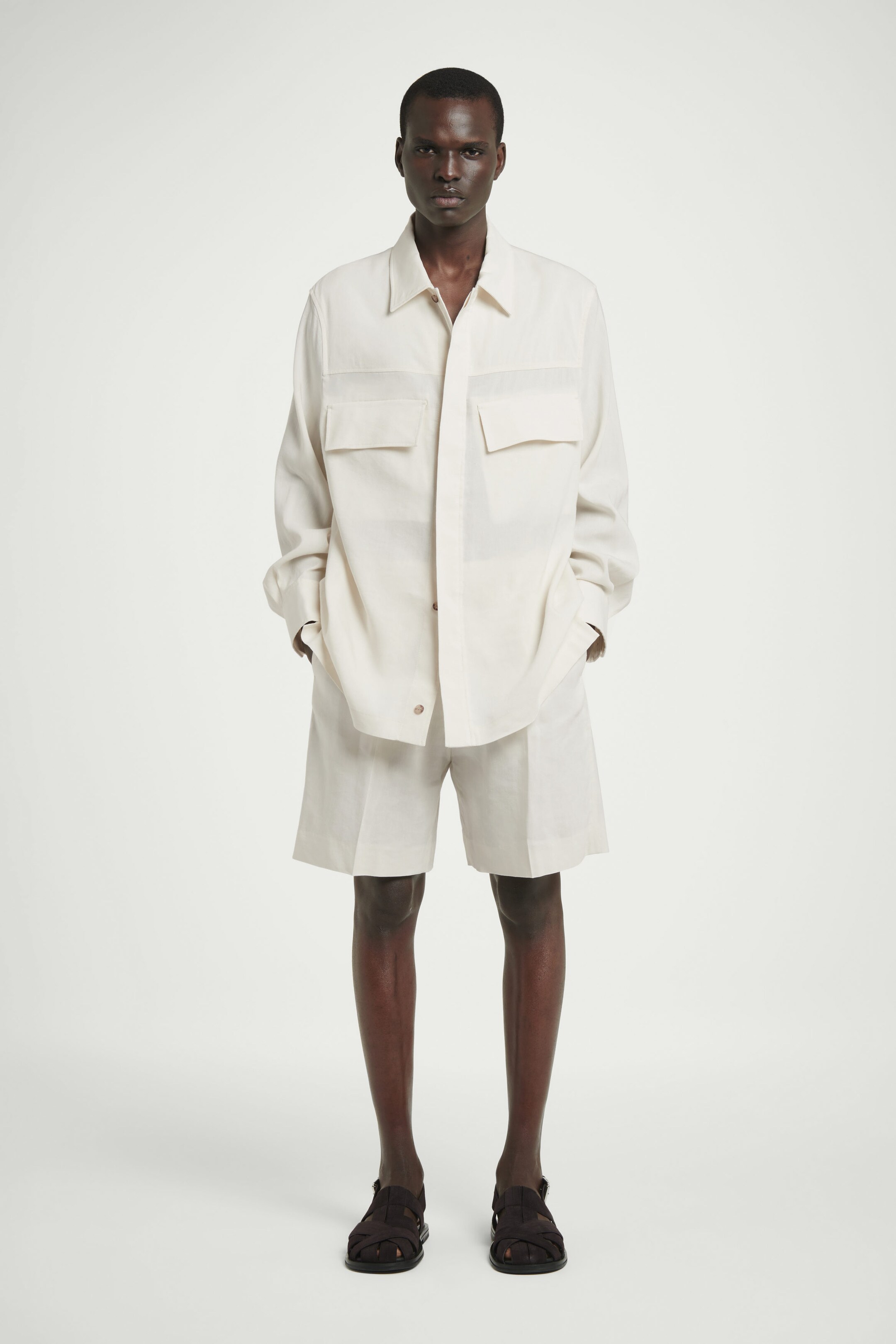 The COS SS25 runway collection builds on the house codes of lasting design and exceptional craftsmanship. Inspired by workwear, this relaxed overshirt is made from a richly textured linen blend and has a pointed collar, utility-style flap pockets and a grosgrain hanger loop – a house signature. Style it with denim or the matching shorts.