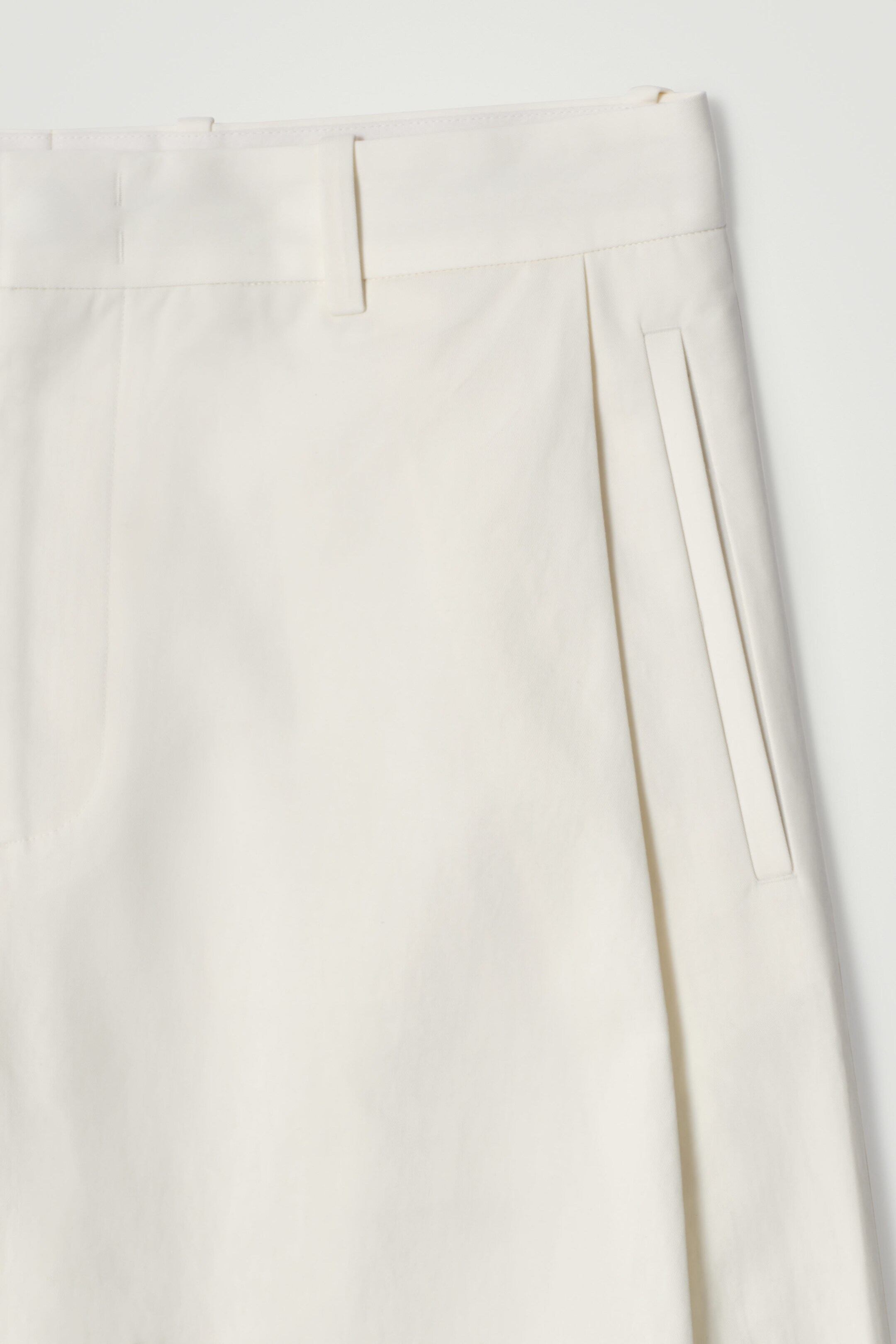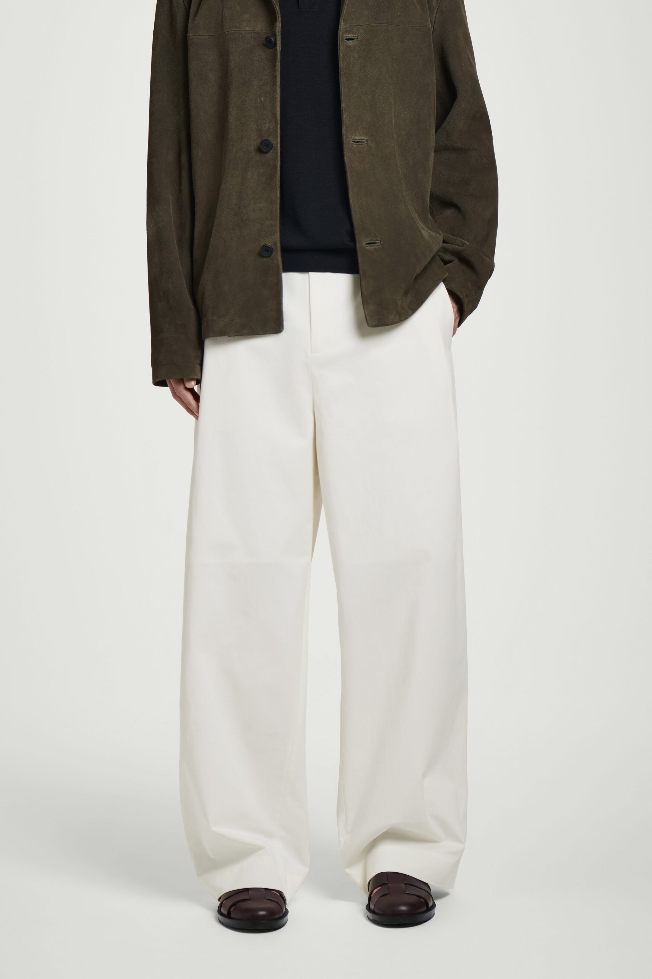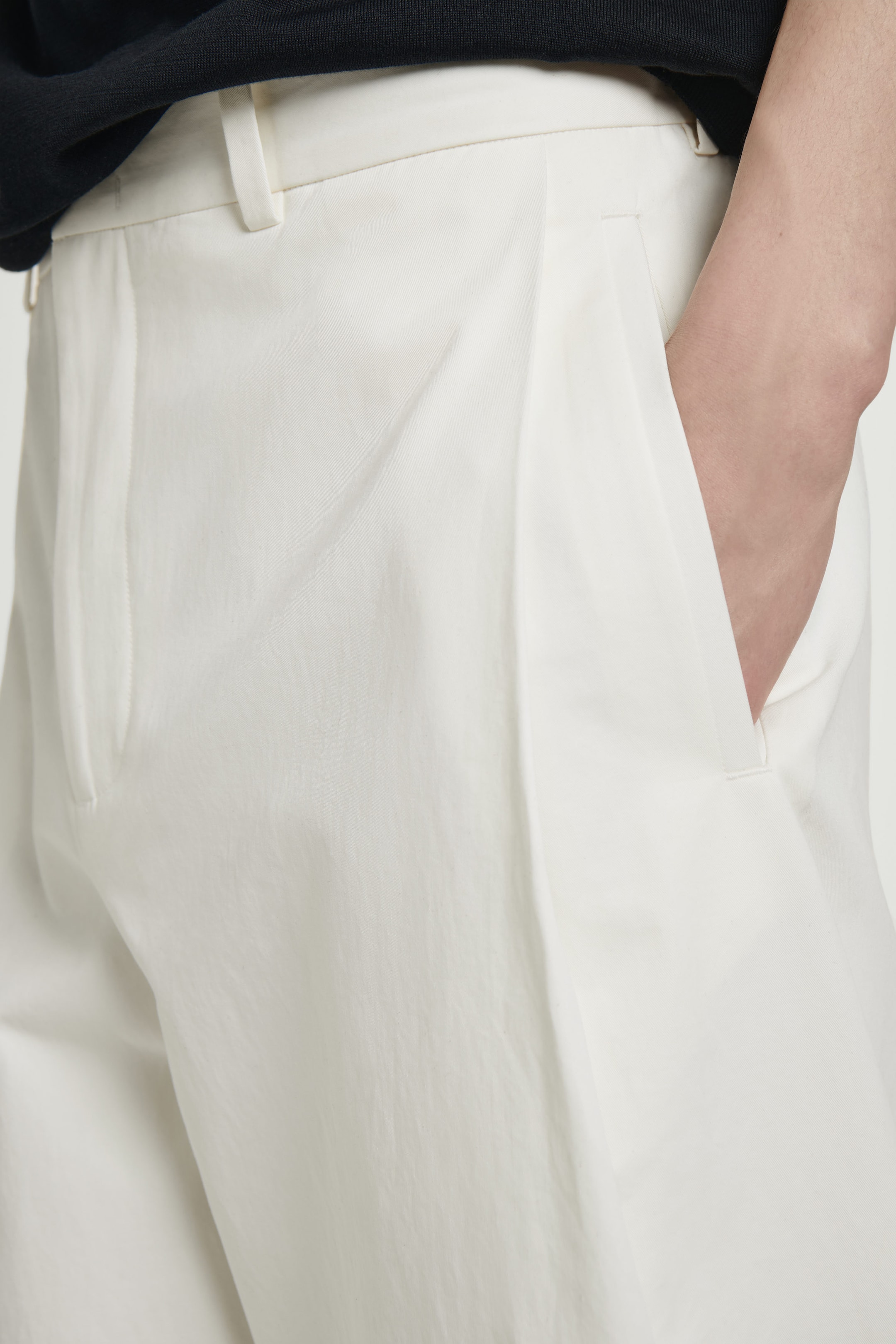 These ecru trousers lend a sense of ease to tailoring. Crafted from cotton, they're designed with wide legs that are enhanced by deep pleats along each side. Wear them with a camp-collar shirt and sandals.
