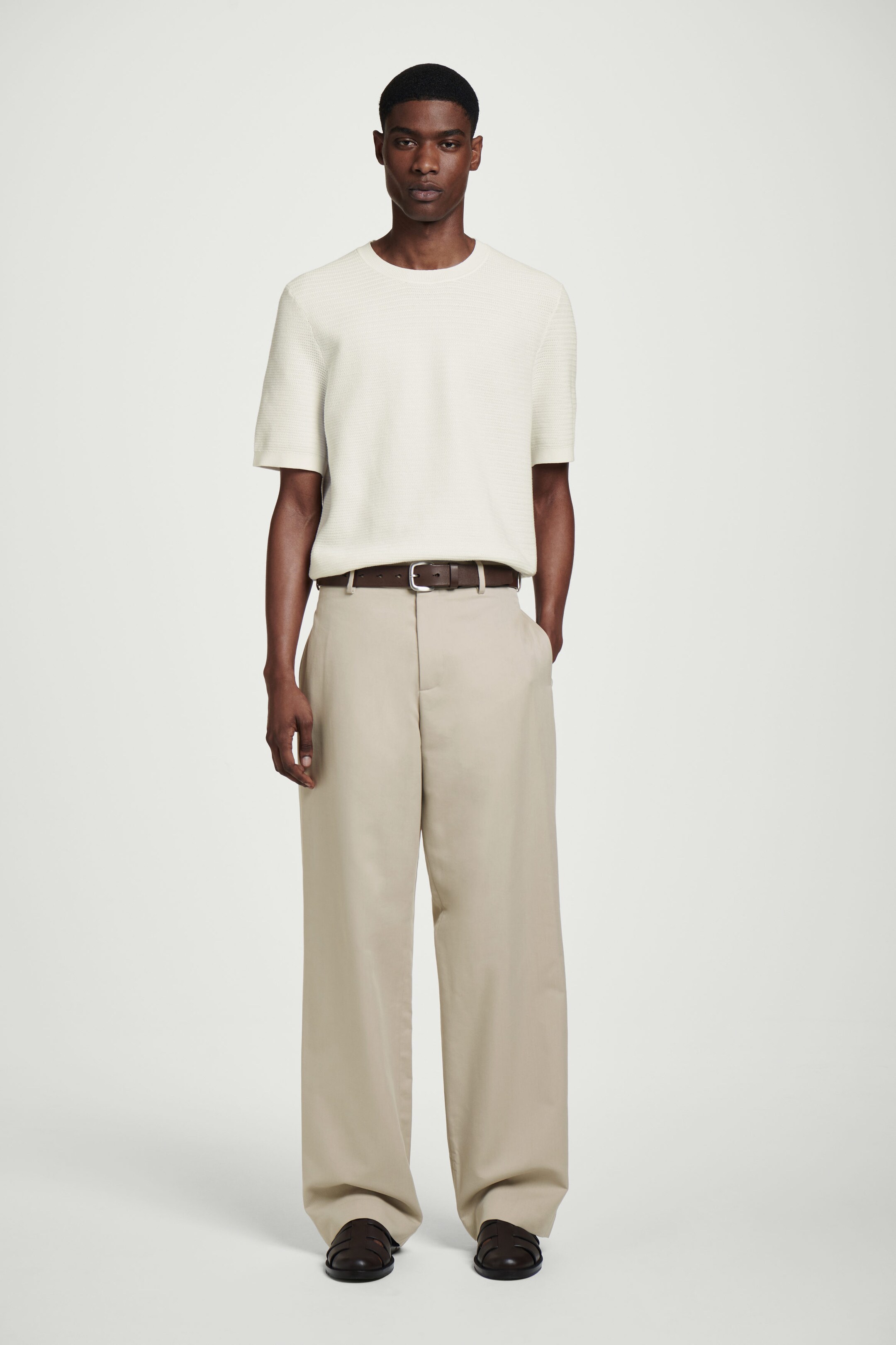 This season, the COS menswear team bring a textural upgrade to classic wardrobe essentials. This laid-back T-shirt is knitted from cotton using a micro cable-knit stitch and features a ribbed crew neck and short sleeves.