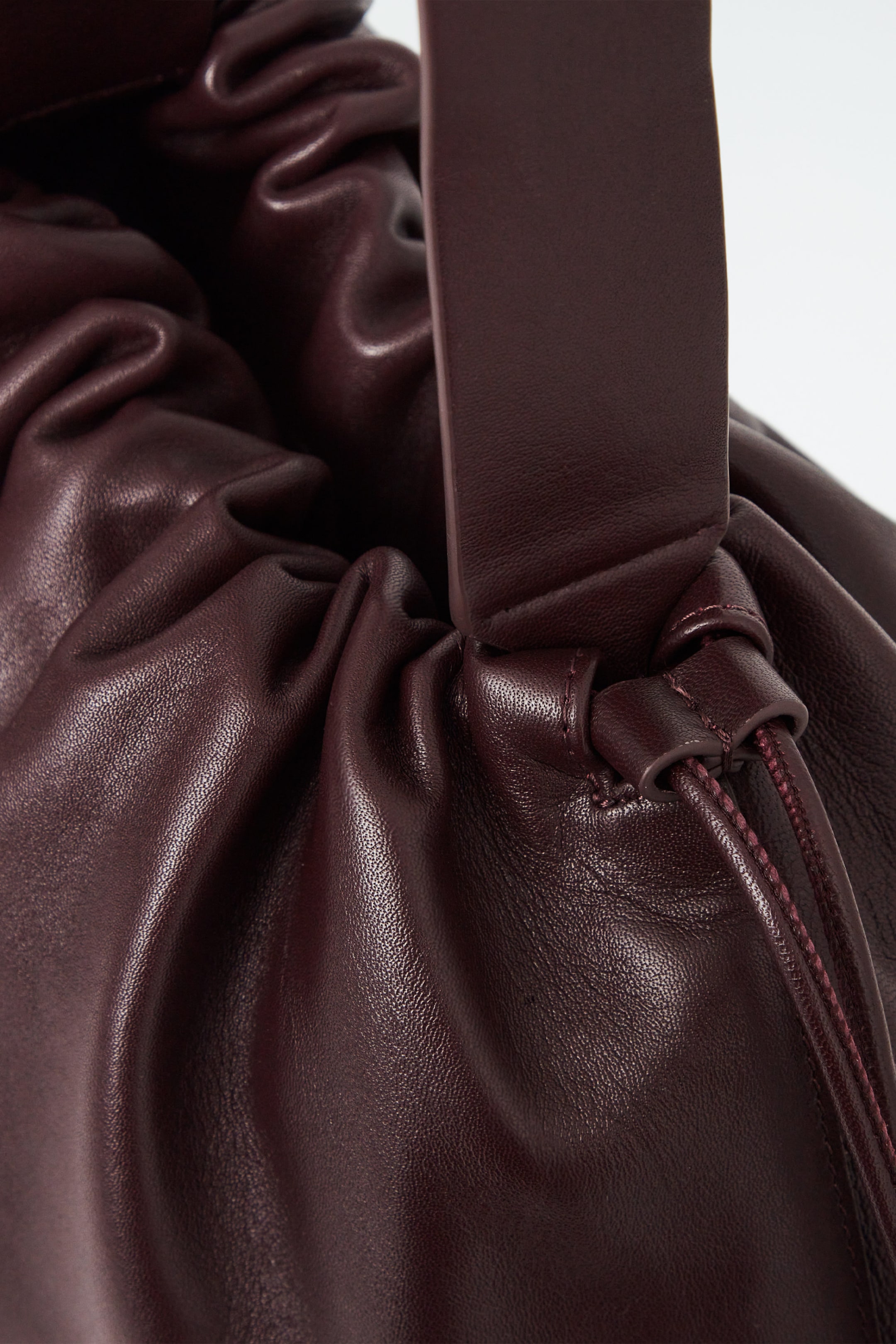 The Cavatelli clutch is crafted from premium leather that's tanned an enduring bordeaux hue using a chrome-free dyeing process. It's shaped with knotted drawstrings at either side that create an exaggerated, softly gathered profile and has slender straps.