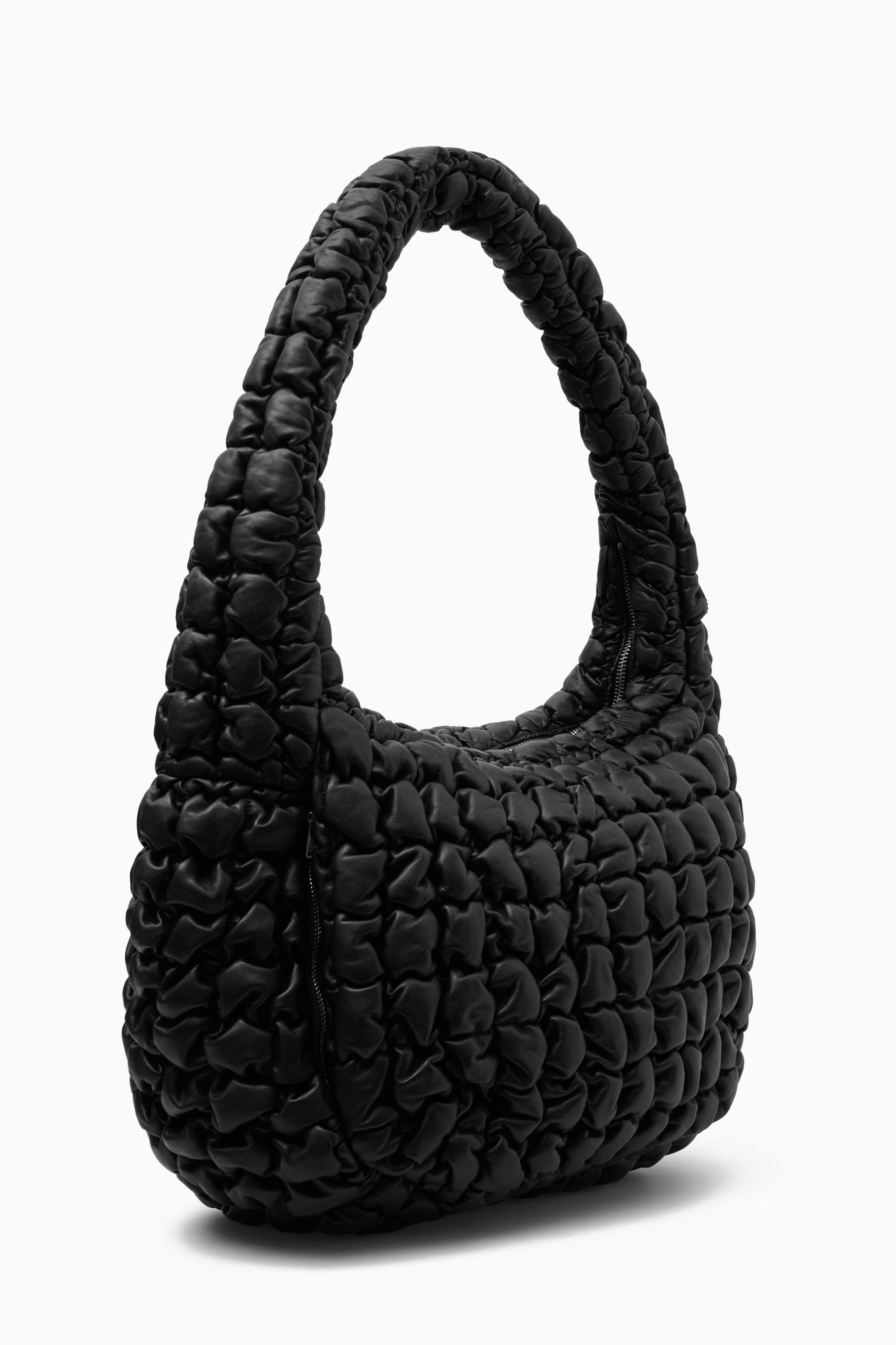 Debuting in butter-soft leather for Autumn Winter 2023, the quilted bag is a COS icon. Retaining the signature pillowy, cloud-like texture, this oversized version is dually designed to be slung across the body or worn on your shoulder and has a subtle zipped pocket on one side to keep your valuables close to hand. It's offered in an enduring black hue and will be the headline of your outfit, no matter what you style it with.