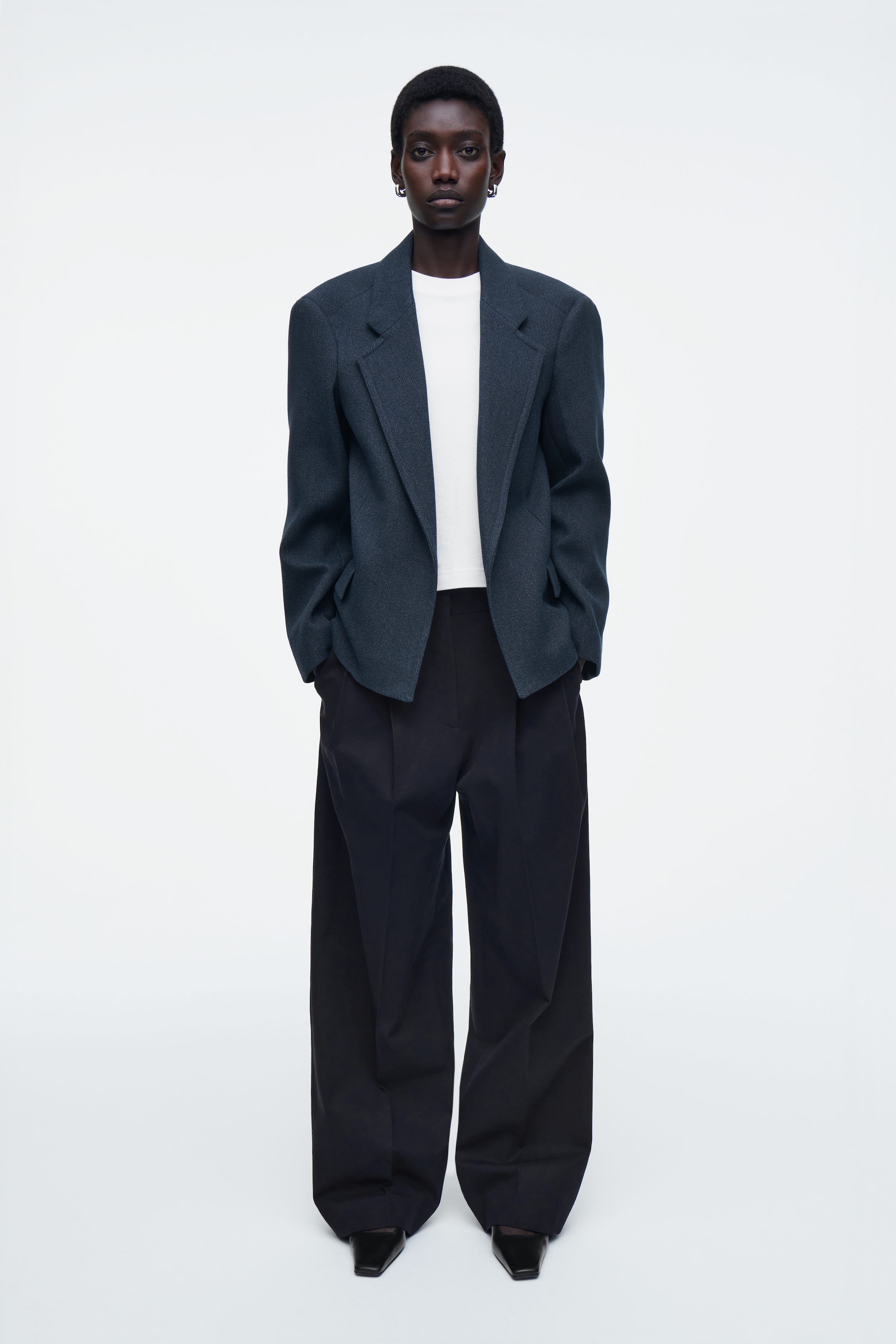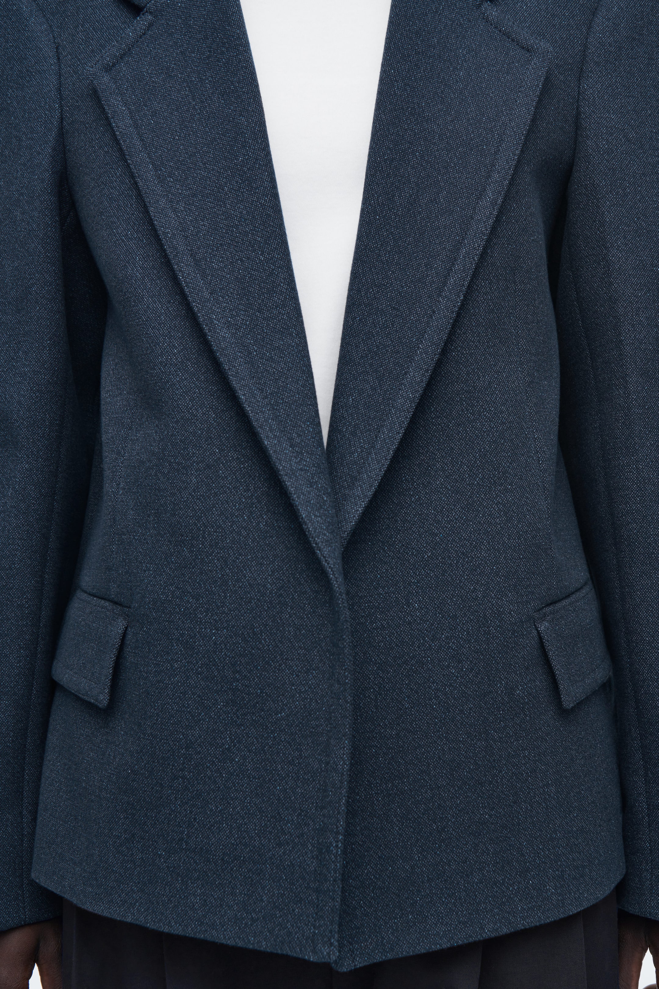 This season, the womenswear team reimagines tailoring through exaggerated proportions. This single-breasted blazer is cut in an oversized shape and designed with power shoulders and darts at the waist to create an angular silhouette. It's made from a recycled-cotton blend with touches of wool and dyed to emulate the look of denim.
