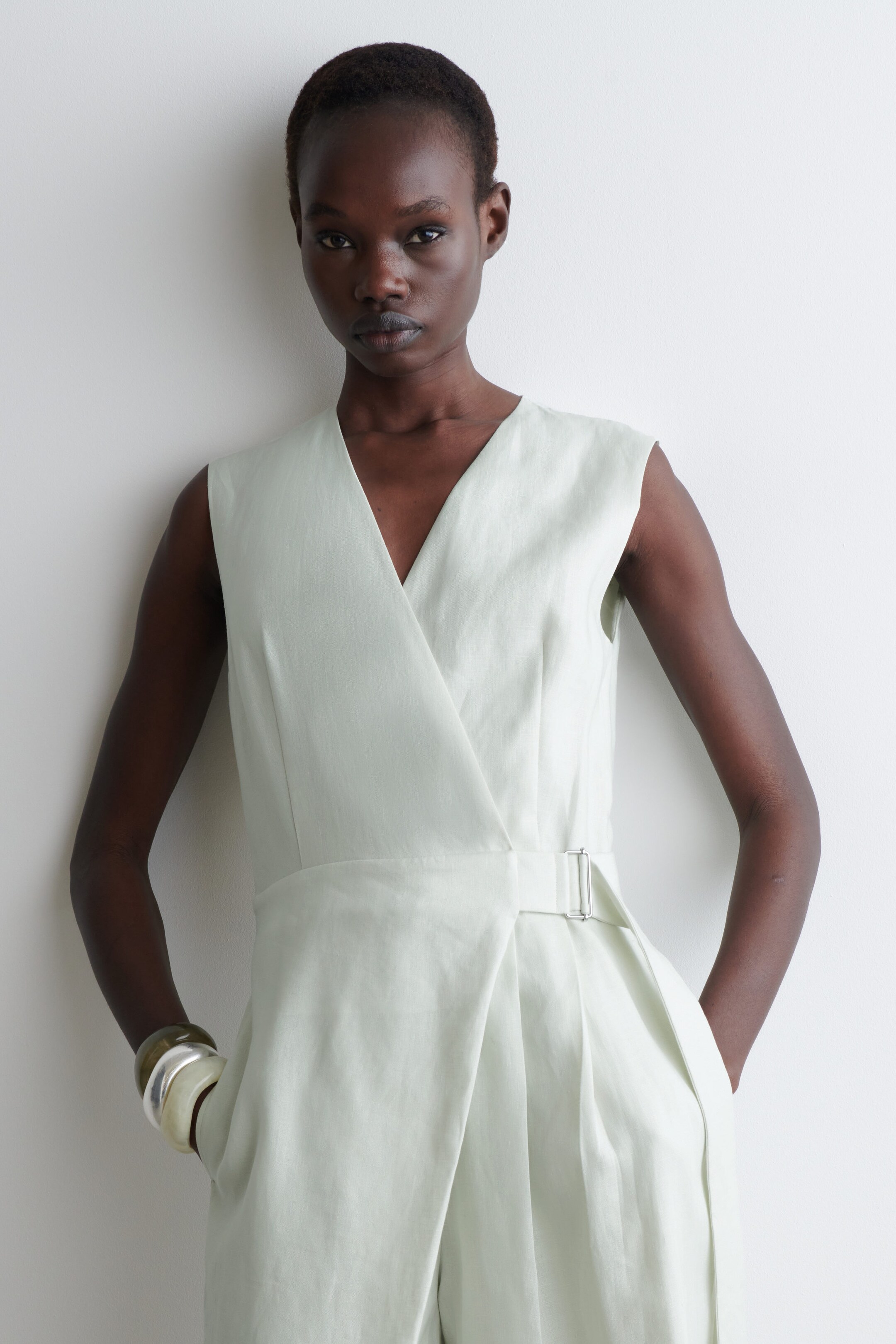 Informed by the principles of tailoring, this modern jumpsuit is cut in a relaxed silhouette with a wrap-around shape and tonal belt at the waist. It's crafted from premium European Flax™, chosen for its natural breathability and lightness.