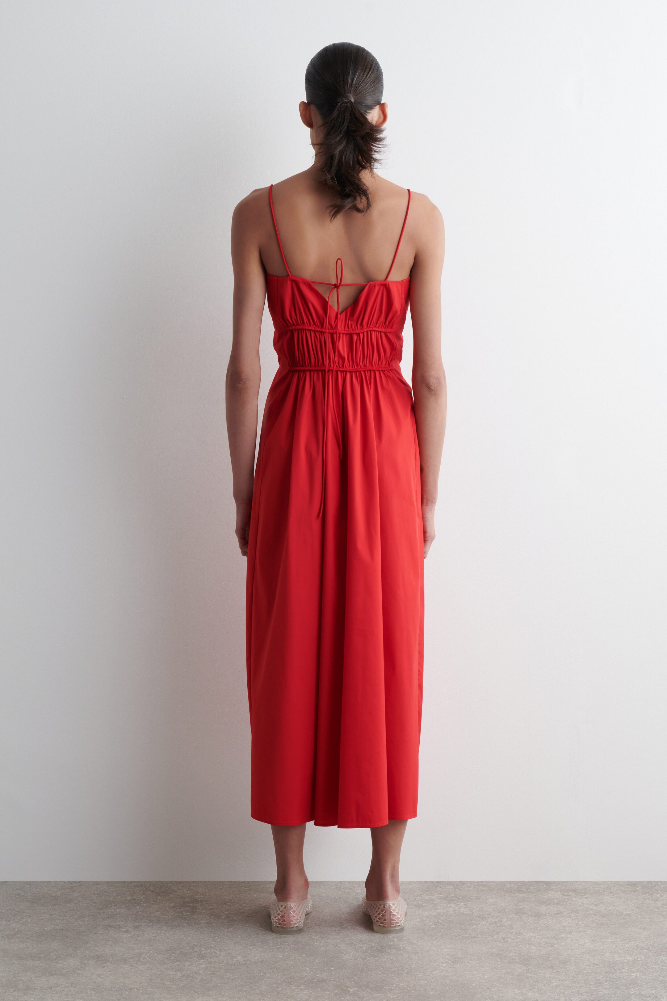 This season, the womenswear team reimagine pared-back silhouettes through ruching techniques. This midi dress is crafted from lightweight Pima cotton and features a gathered bodice, slender straps and an open V-back with tie detailing.