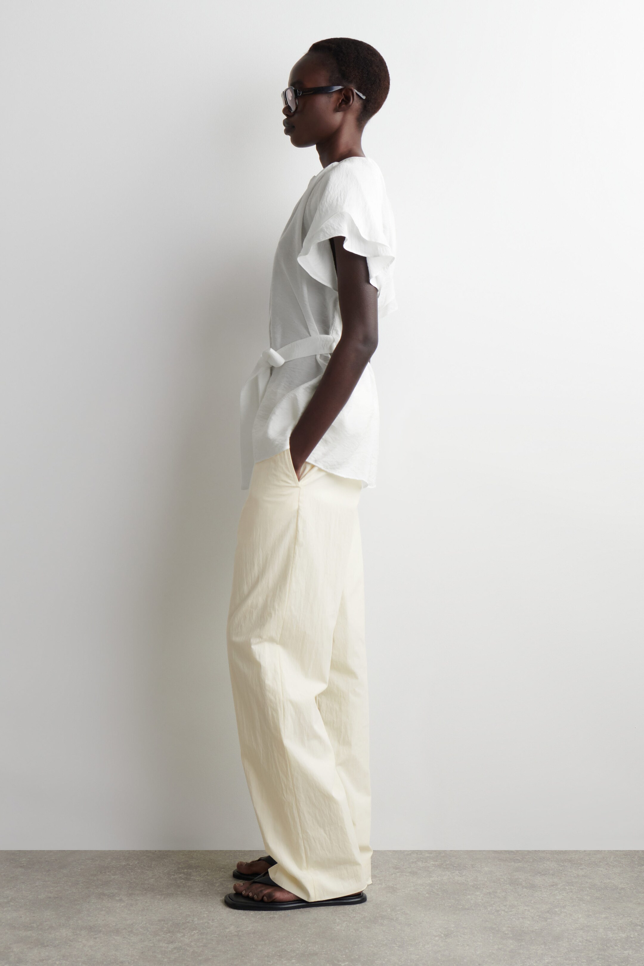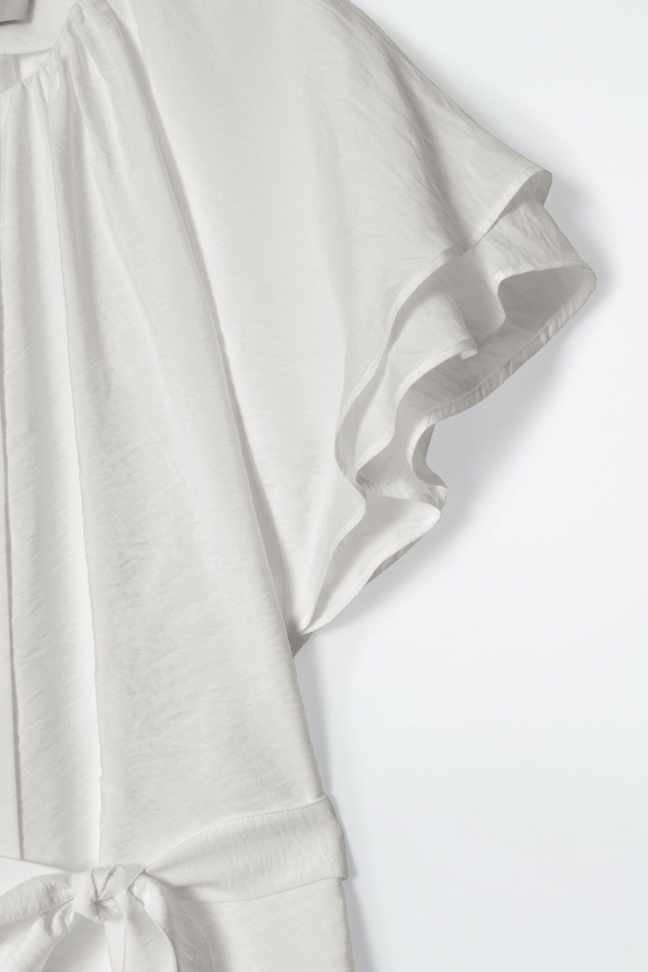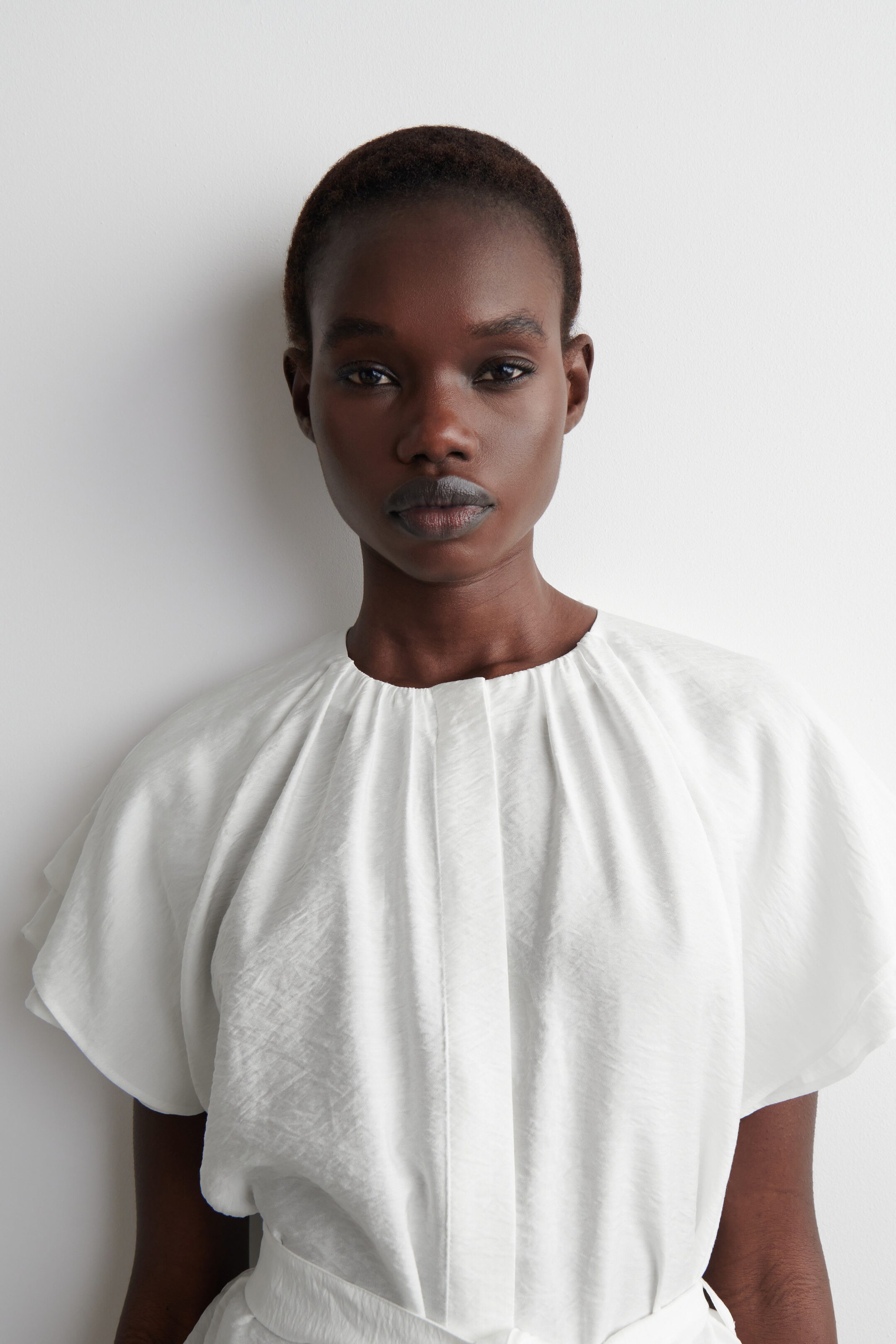 Offered in a muted white tone, this sophisticated blouse is crafted from a lightweight ECOVERO™ Viscose blend and shaped with a gathered neckline and layered raglan sleeves. The tonal ties subtly define the waist.