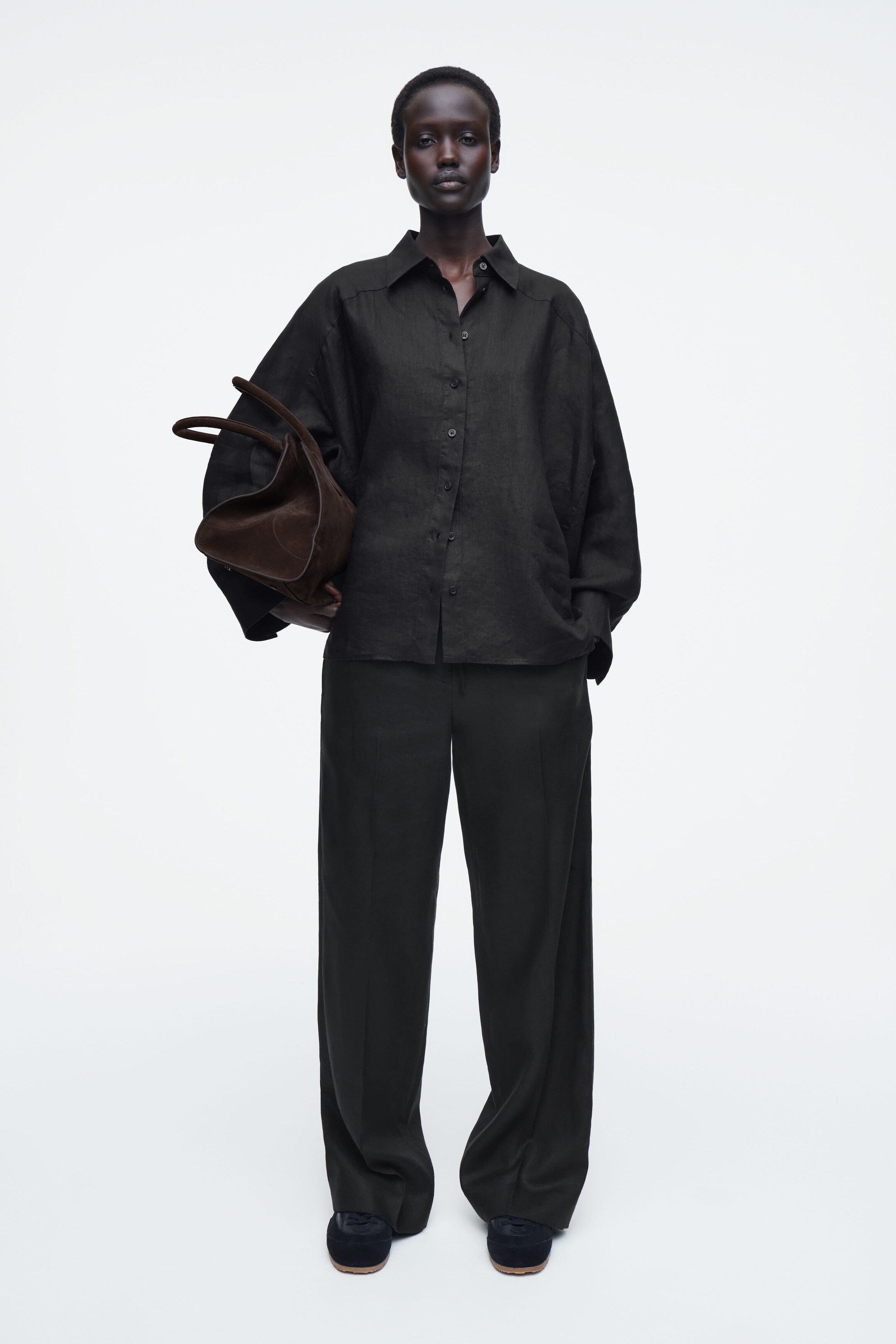 A prelude to balmy weather, this black shirt is crafted from linen that's naturally light, airy and fresh. It's designed in a classic square-cut shape and features a pointed collar, raglan sleeves and double-cuff detailing. Our stylists suggest layering it over a tank top as the temperatures rise.