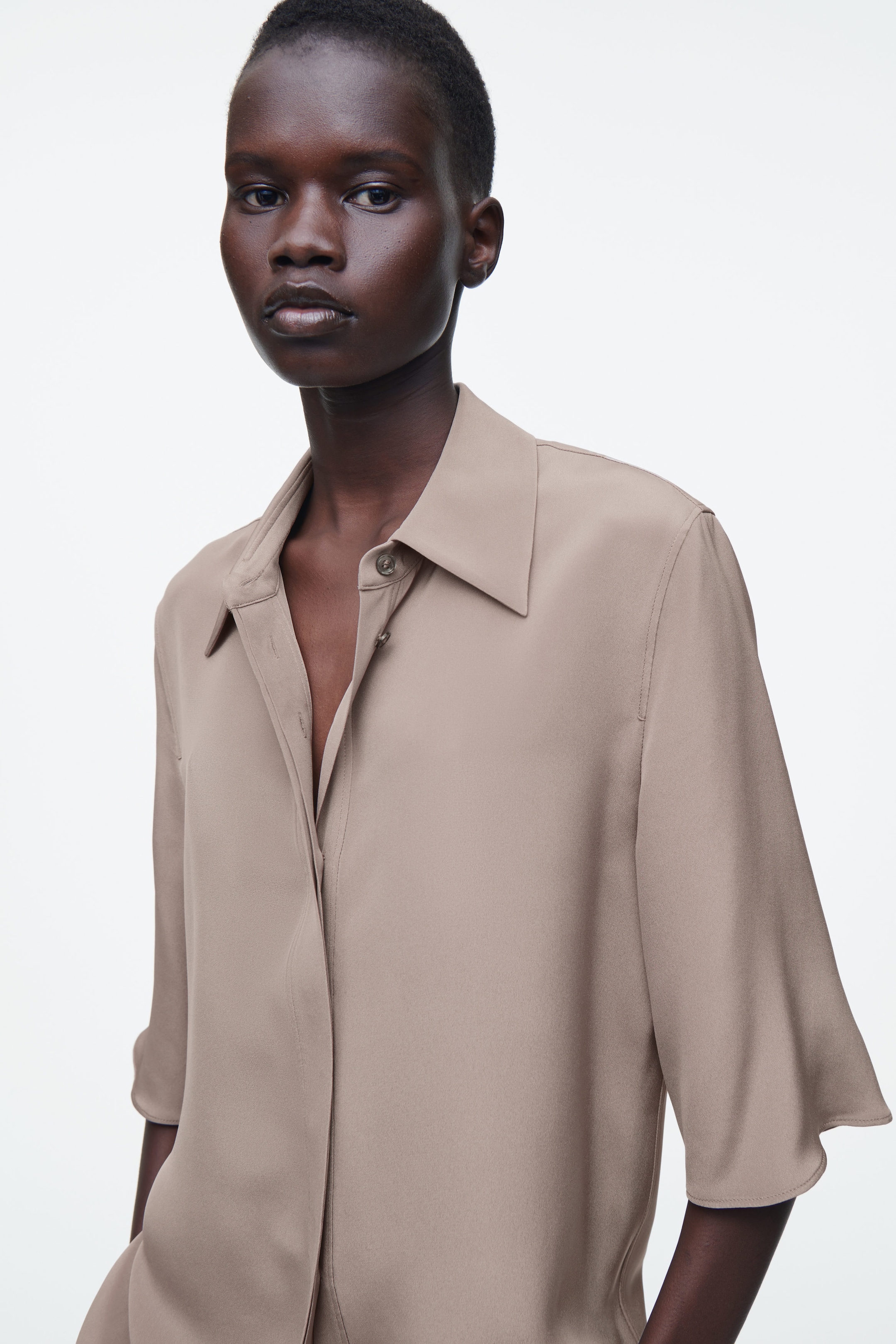 The COS SS25 runway collection builds on the house codes of lasting design and exceptional craftsmanship. Rendered in an earthy fawn tone, this short-sleeved shirt embodies a modern elegance – note the clean pointed collar, elongated shape and mother-of-pearl buttons. The 100% mulberry silk-crepe cloth was selected for its luxuriously soft handle and effortless drape. Style it with the matching shorts.