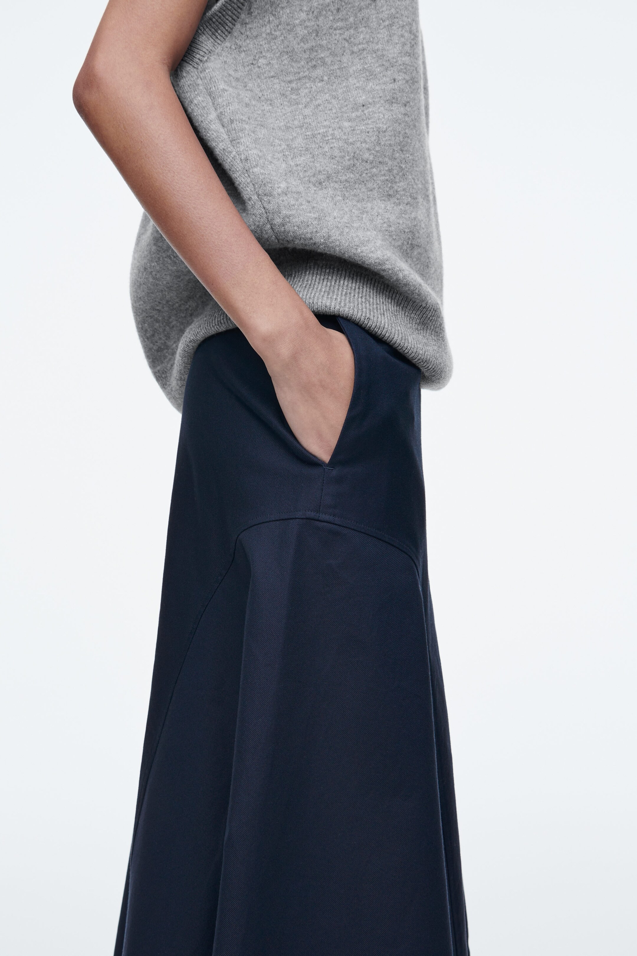 Channelling a modern elegance, this midi skirt is designed with curved side seams that create a rounded silhouette. It's crafted from cotton in a rich midnight tone and features an elasticated waist that zips up at the back. Our stylists suggest pairing it with knee-high boots.
