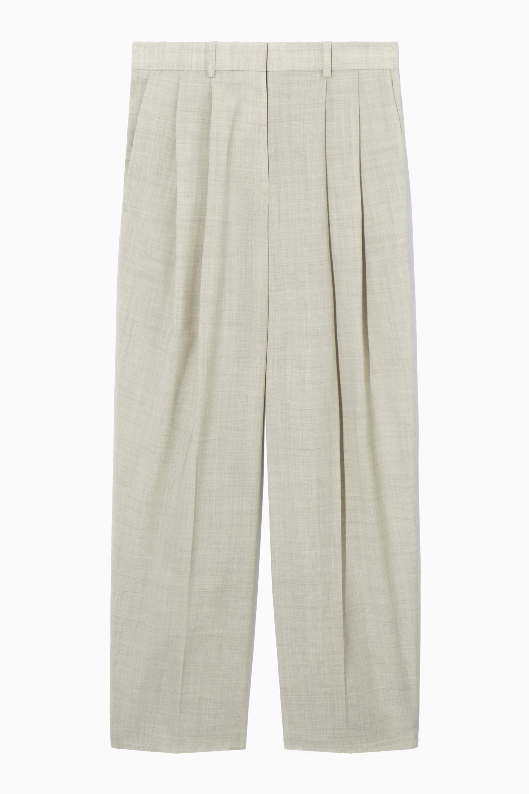 Crafted from pure wool, these wide-leg tailored trousers have been designed to fall loosely over the body. The front pleats and back darts create a flattering silhouette, while the side slip pockets and back welt pocket make them functional. The concealed adjustable-button tab allows the trousers to be worn low-slung or on the waist. For a complete set wear them with the matching blazer.