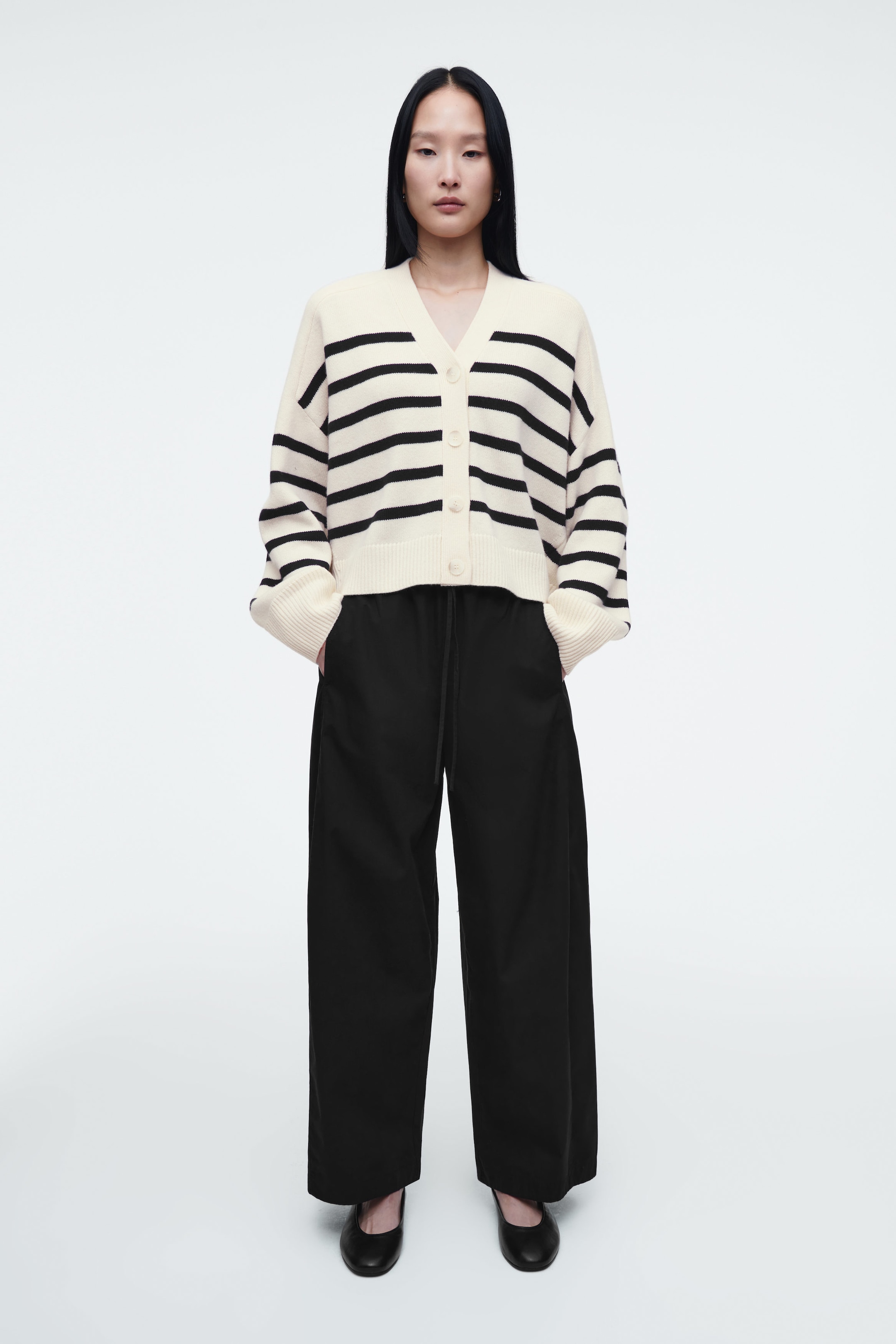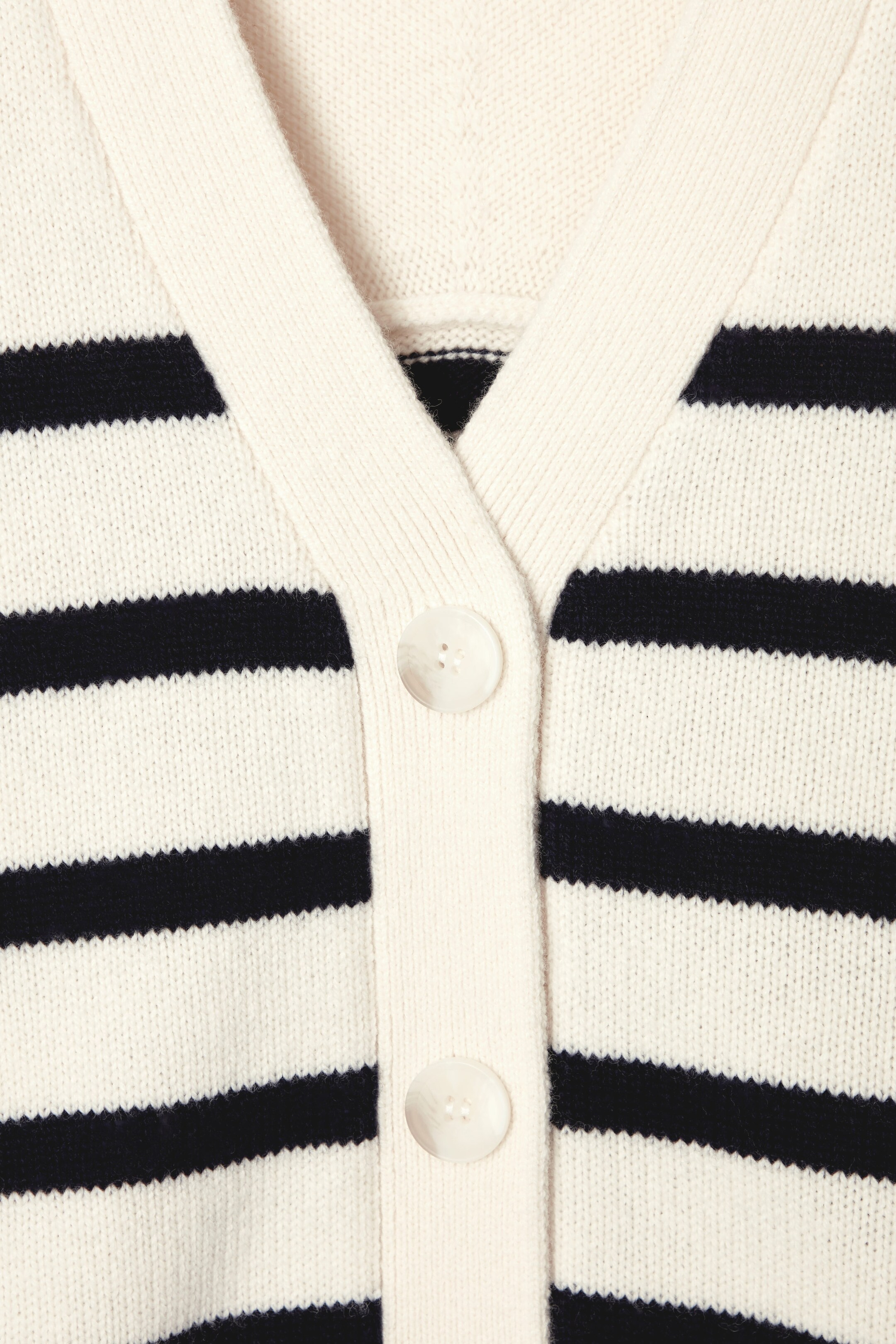 This classic cardigan will form the foundation of your transitional outfits. Knitted from pure merino wool, it's decorated with contrasting stripes and has a V-neckline, front patch pockets and a wide ribbed hem.