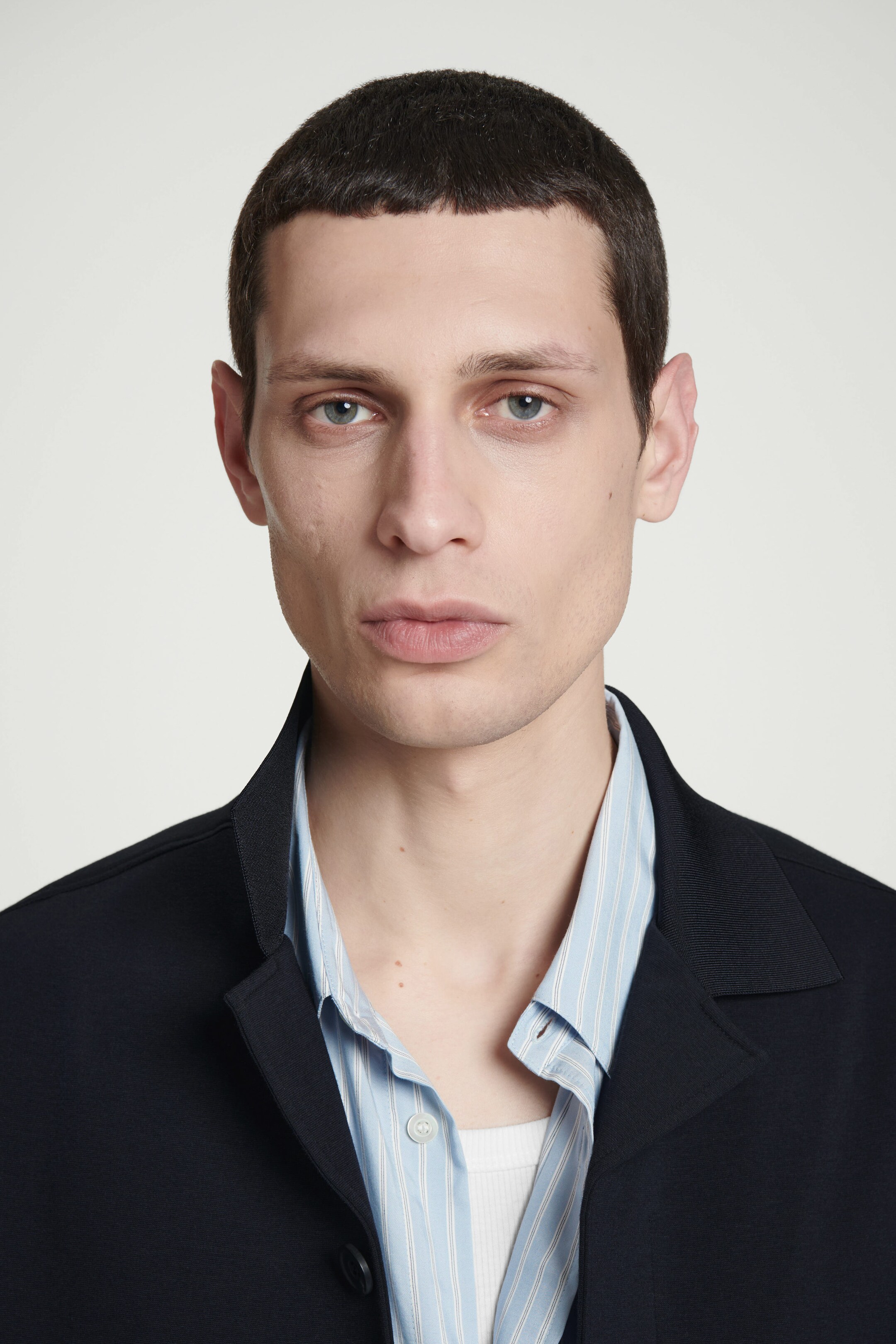 Offered in versatile navy, this jacket is crafted from interlock cotton-blend jersey for a substantial, premium hand feel. It's cut in a relaxed shape that layers well over tees and features a ribbed camp collar, welt pockets and elasticated trims at the cuffs and hem.