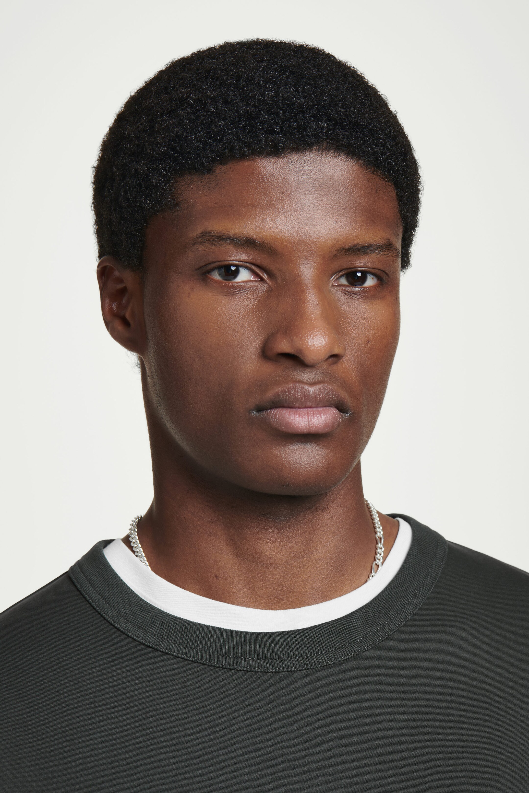 This forest-green long-sleeved T-shirt is made from interlock cotton, a double-layered knitted jersey that's soft, durable and warm. It's cut in a relaxed shape and has a classic crew neck.