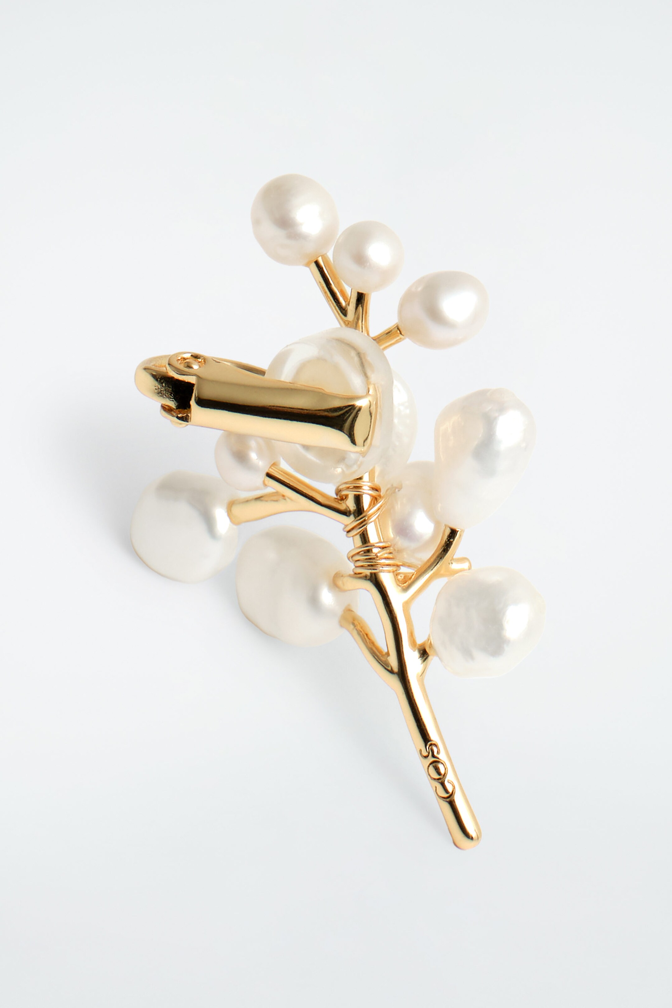 Intentionally mismatched, these clip-on earrings are adorned with baroque freshwater pearls that bud from each gold-plated branch. One piece climbs up the lobe, while the other cascades below the ear.