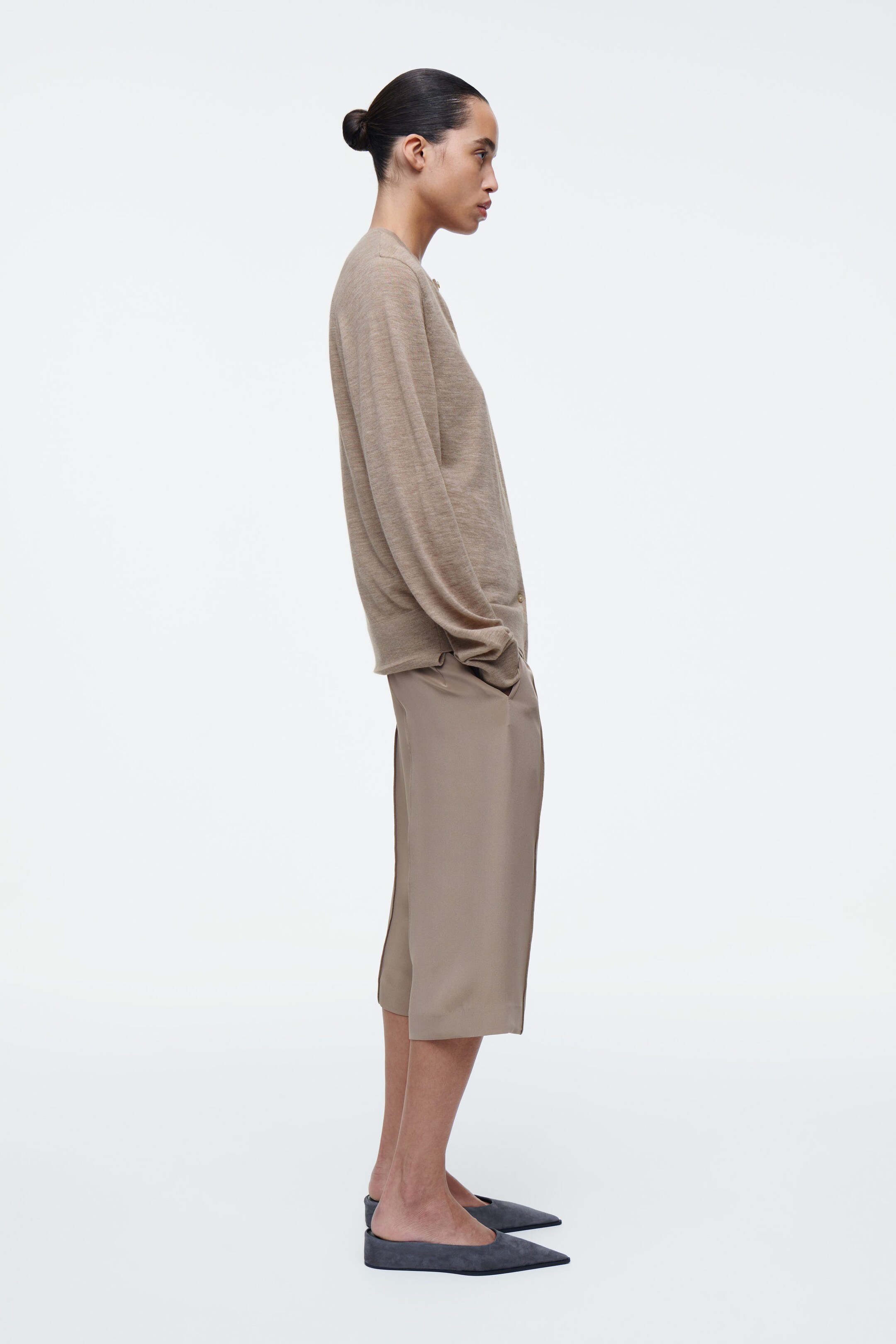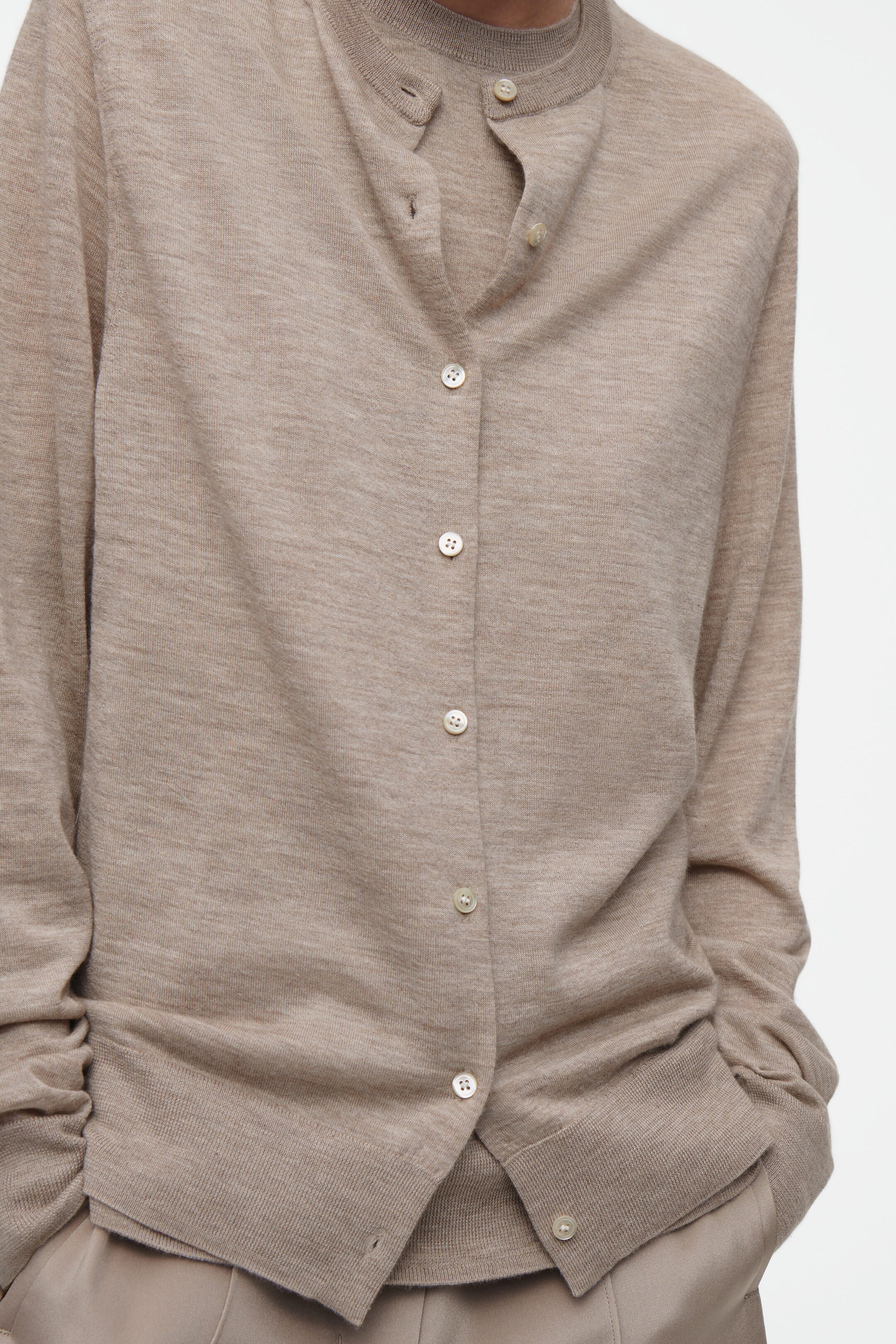 The COS SS25 runway collection builds on the house codes of lasting design and exceptional craftsmanship. Offering an elevated take on layering, this modern piece comprises a vest and cardigan, bound together by a signature hanger loop. It's knitted from premium ultra-fine cashmere that's luxuriously soft to the touch and finished with premium mother-of-pearl buttons. Style it with the long sleeves tied around the waist.