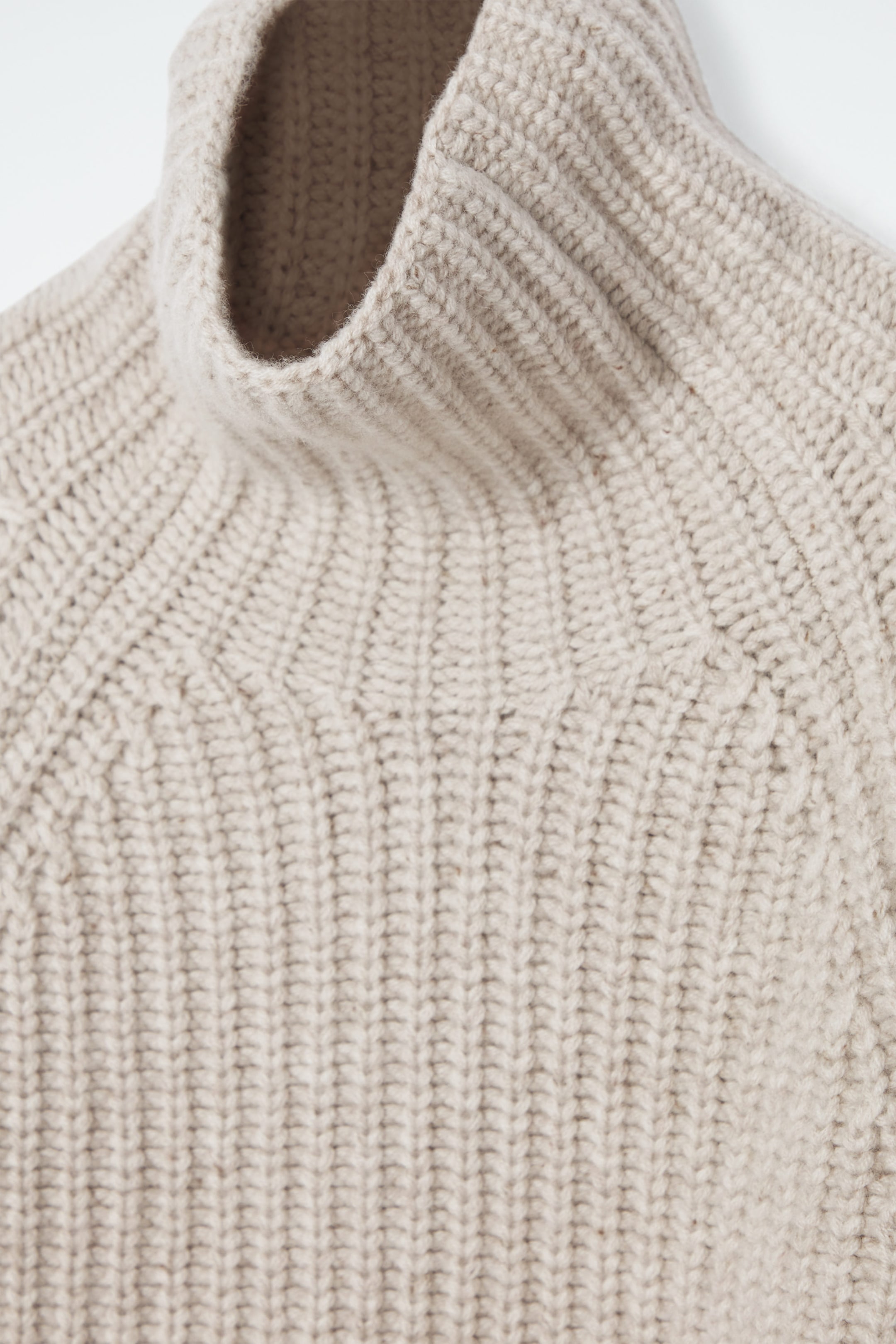 Offered in a natural beige tone, this relaxed jumper is rib-knitted from a premium blend of merino wool and luxuriously soft recycled cashmere. It's designed with an exaggerated funnel neck, shaped sleeves and fitted cuffs.