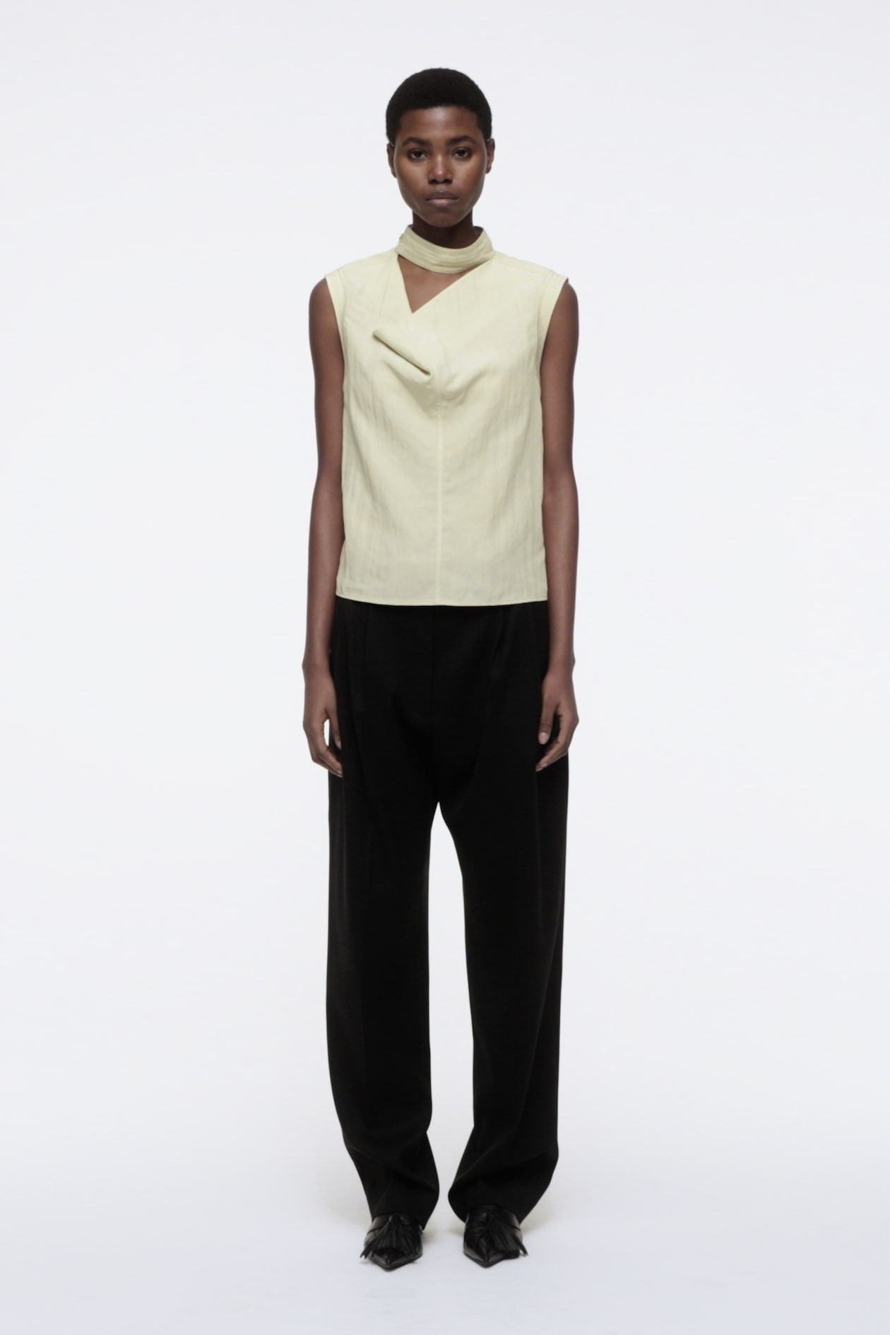 Modernising utilitarian codes, this blouse is designed with a tab that buttons effortlessly across the cowl neckline. It's crafted from a fluid TENCEL™ Lyocell-blend in a soft pistachio hue and features a box pleat at the back and slits at the hem. Our stylists suggest pairing it with washed denim.