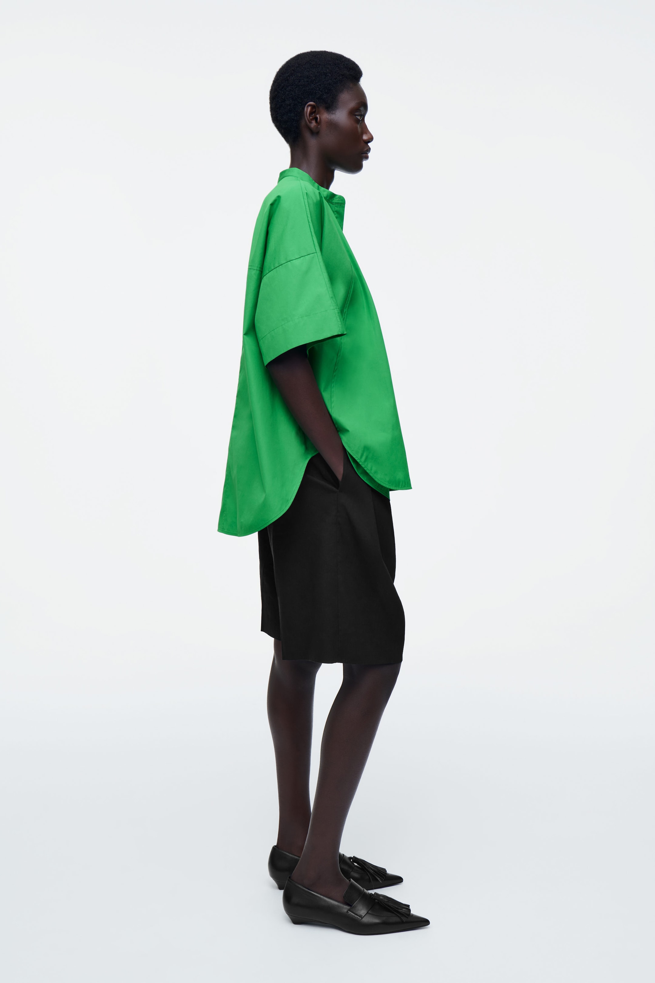 This vibrant green piece proposes a renewed take on the classic shirt. Cut in an oversized shape, it's designed with short sleeves, a rounded hem and a bib-front detail that gives it a layered look. Style it with longline shorts and mules.