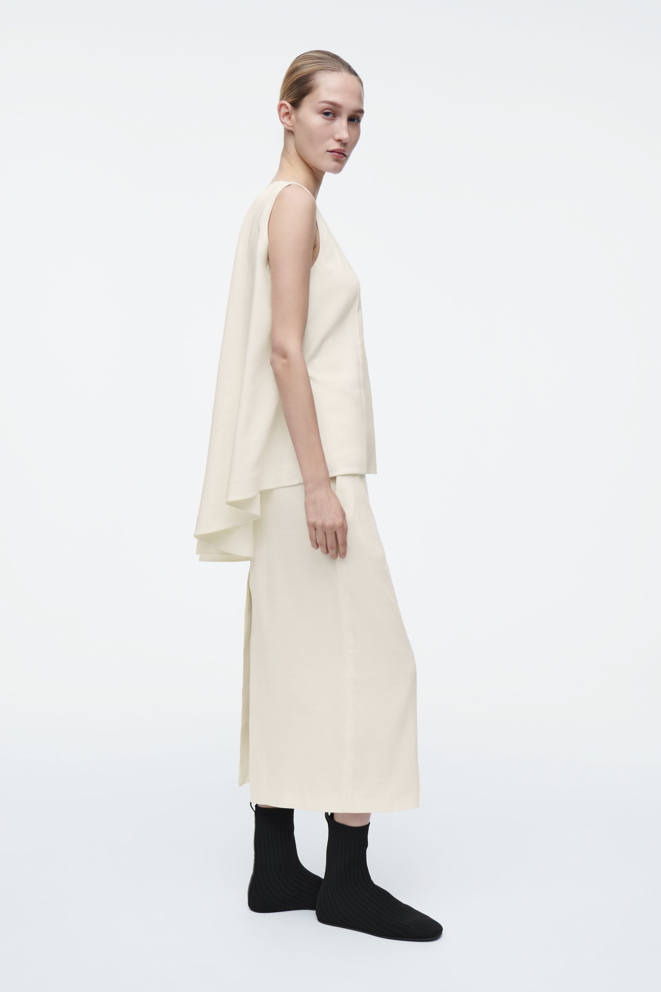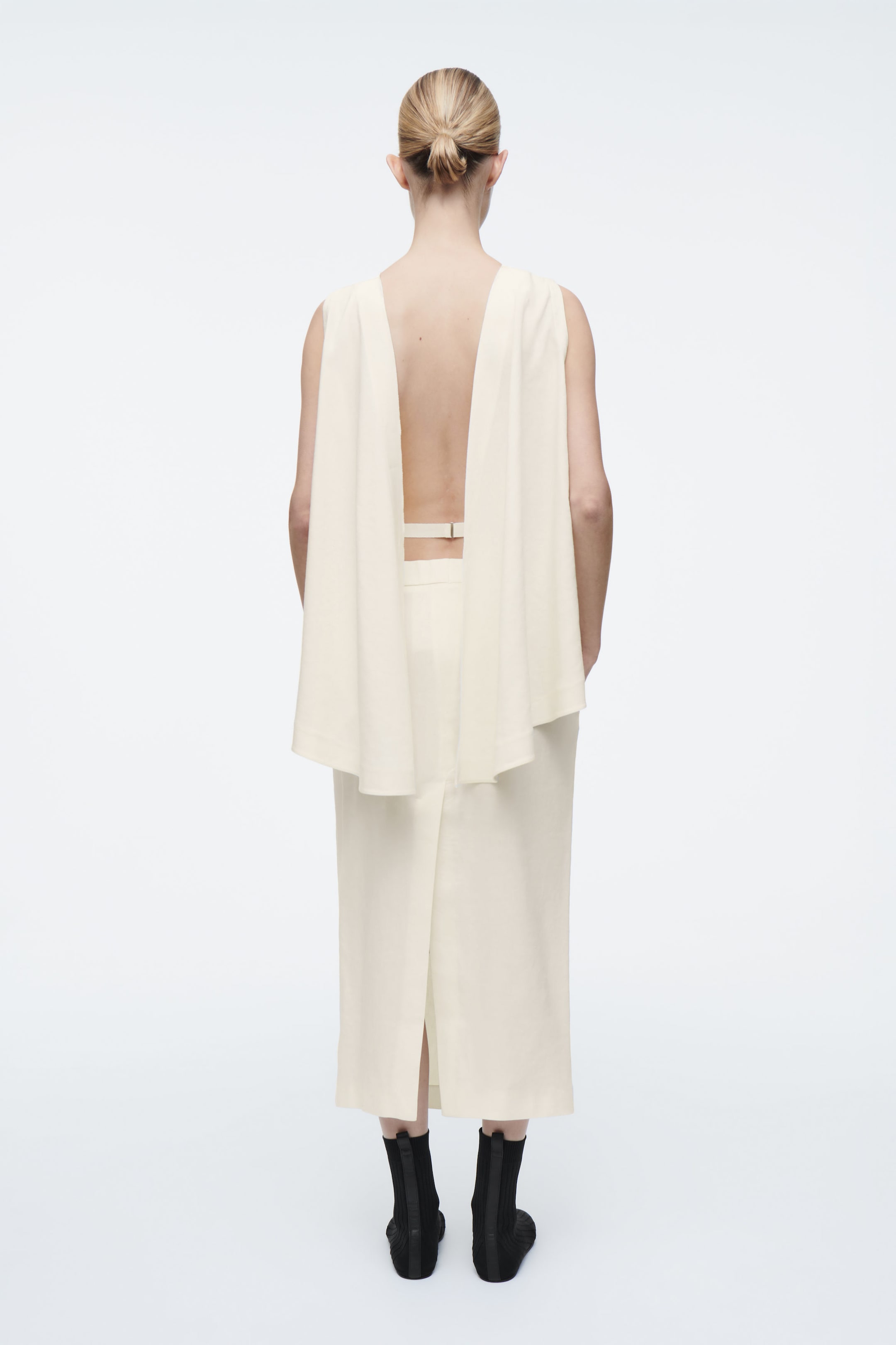 The COS SS25 runway collection builds on the house codes of lasting design and exceptional craftsmanship. A deconstructed take on tailoring, this sleeveless top is crafted from a linen-blend cloth chosen for its effortless drape and lightly textured handle. Its fluid silhouette is anchored by a single grosgrain strap at the open back, creating a striking focal point. Style it with the matching skirt.