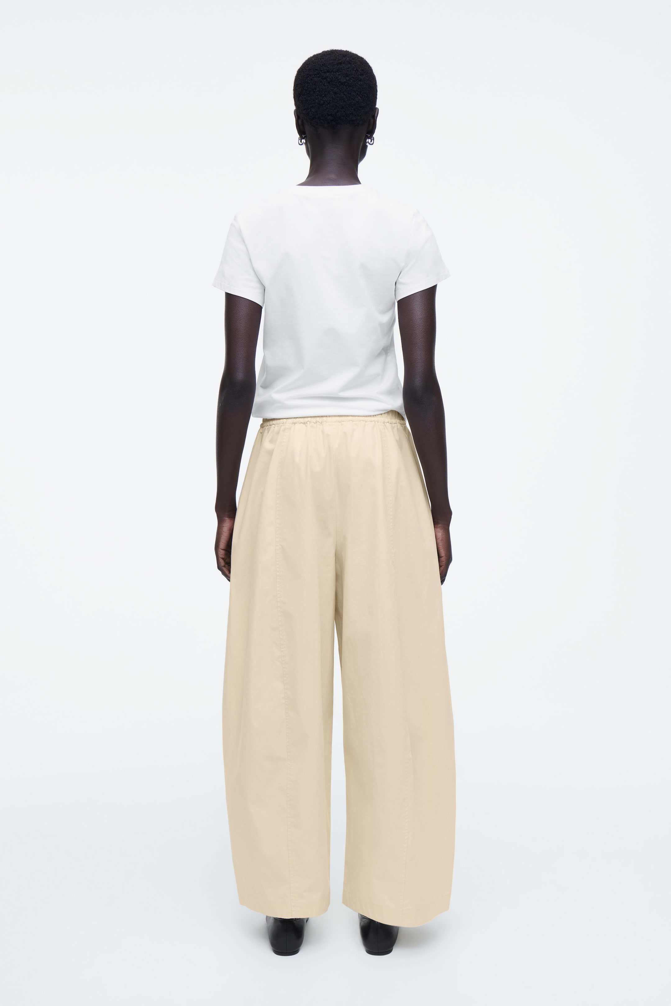 Crafted from lightweight cotton, these relaxed trousers are shaped with off-centre seams that subtly define the voluminous barrel legs. Design details include the wide elasticated waistband, tonal drawstrings and slanted side pockets.
