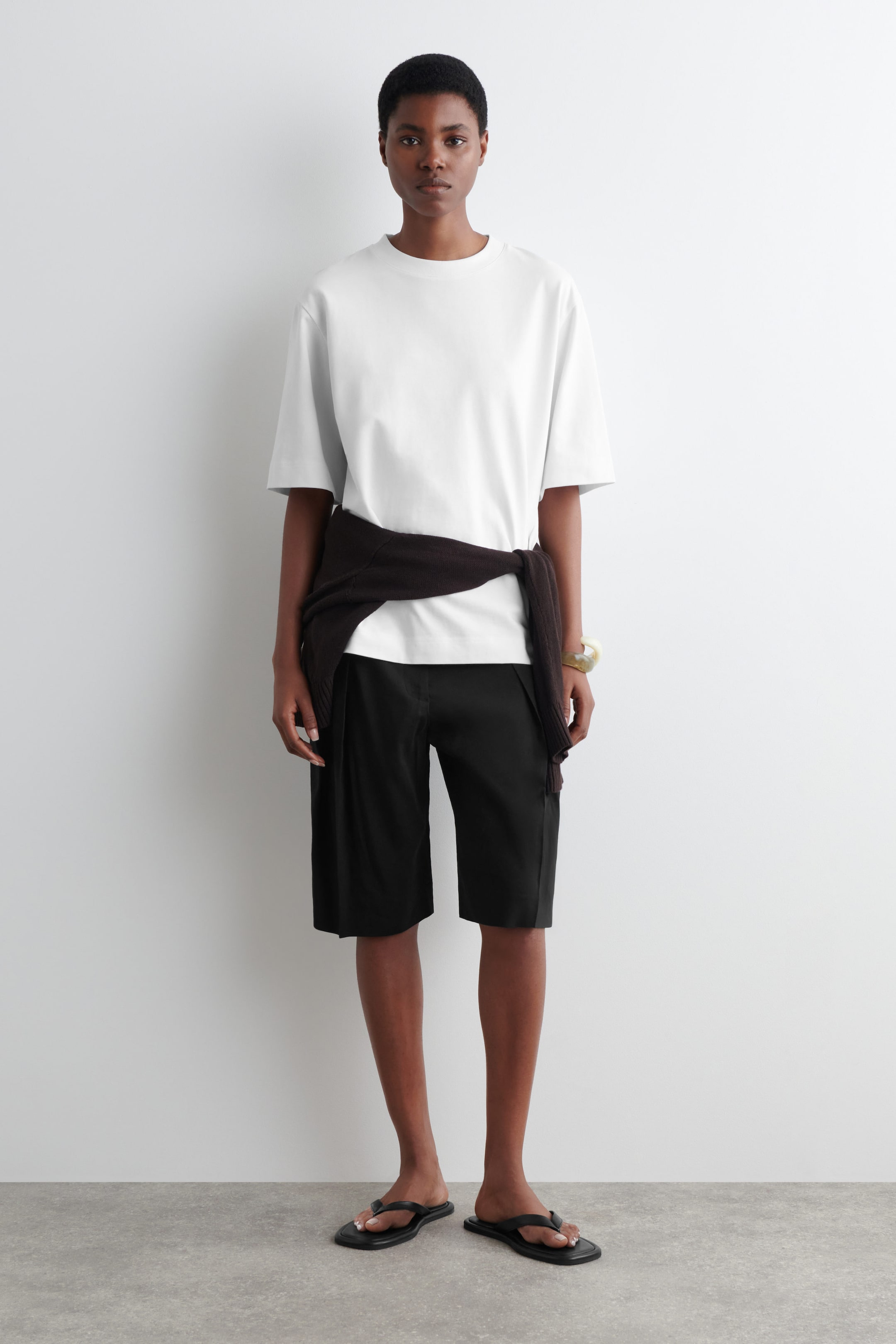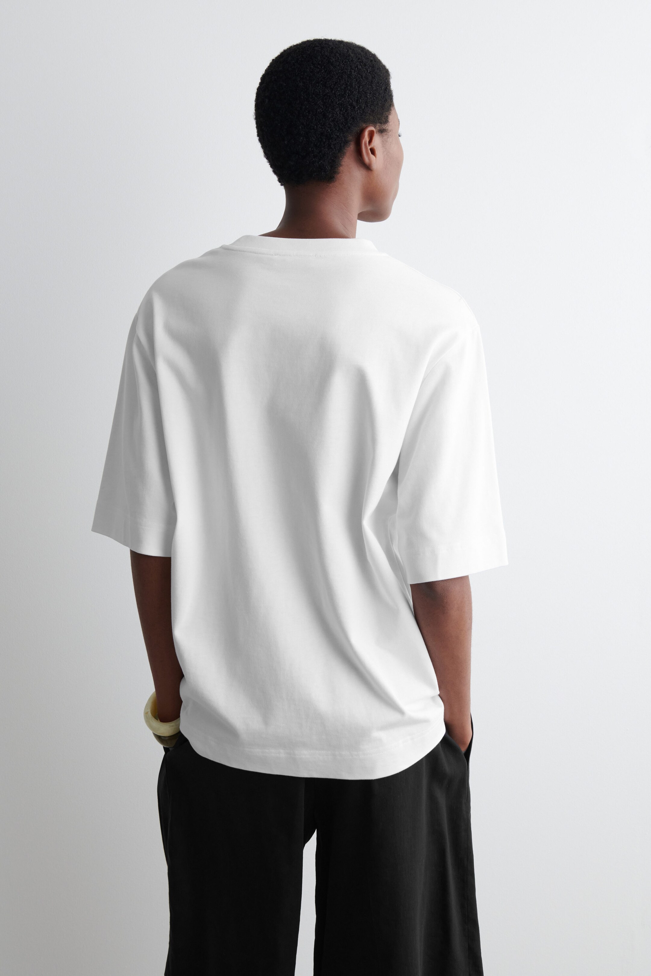 Oversized silhouettes have long been a COS design signature. Effortlessly slouchy, this crisp white T-shirt is crafted from soft organic cotton-blend jersey and shaped with a ribbed crew neck, extended short sleeves and a wide hem for a laid-back drape.