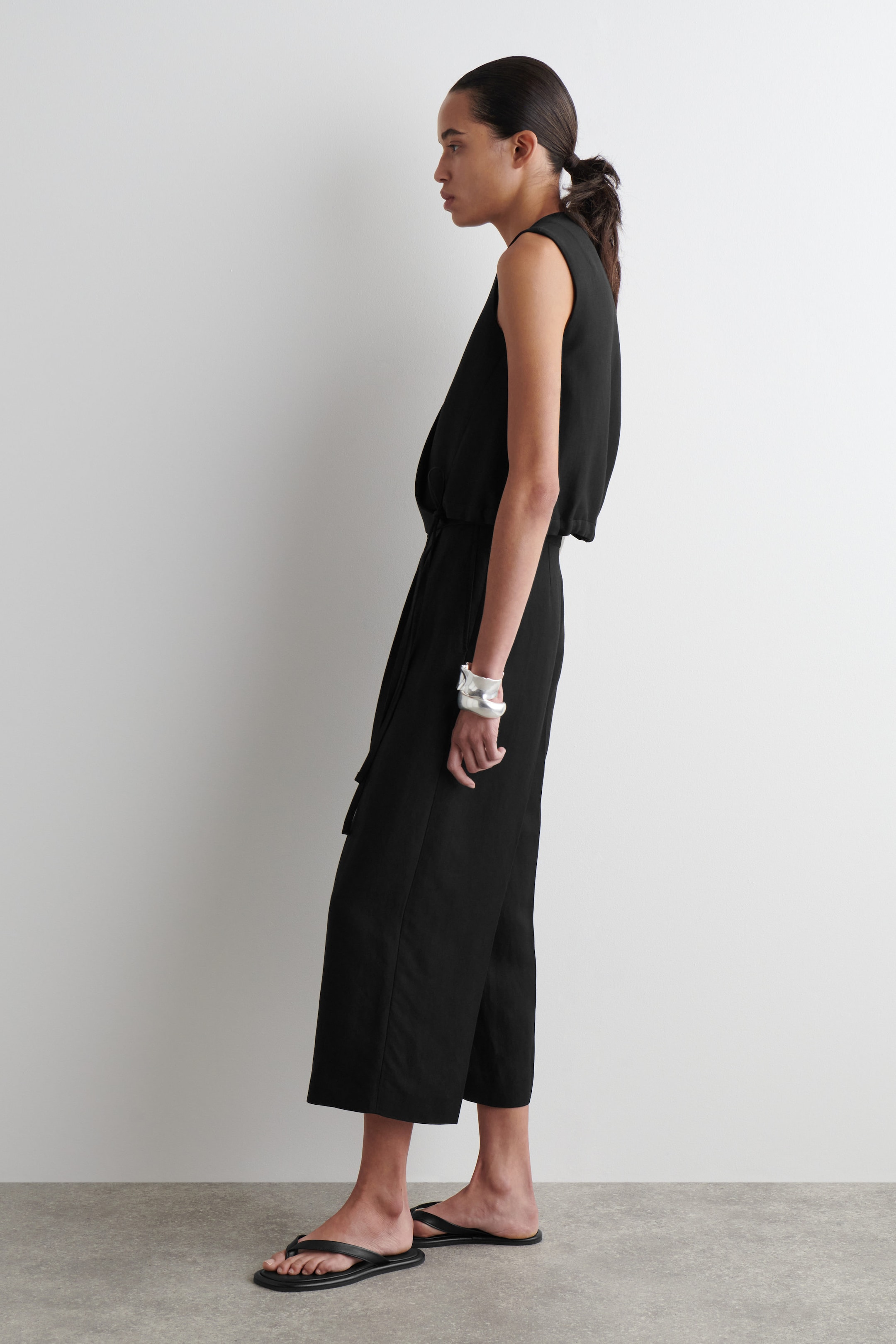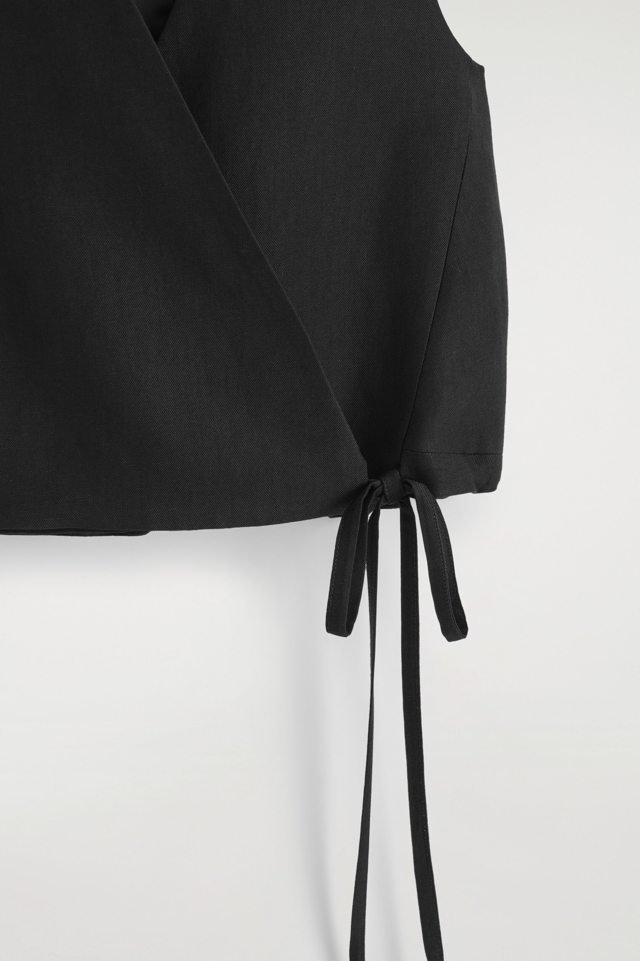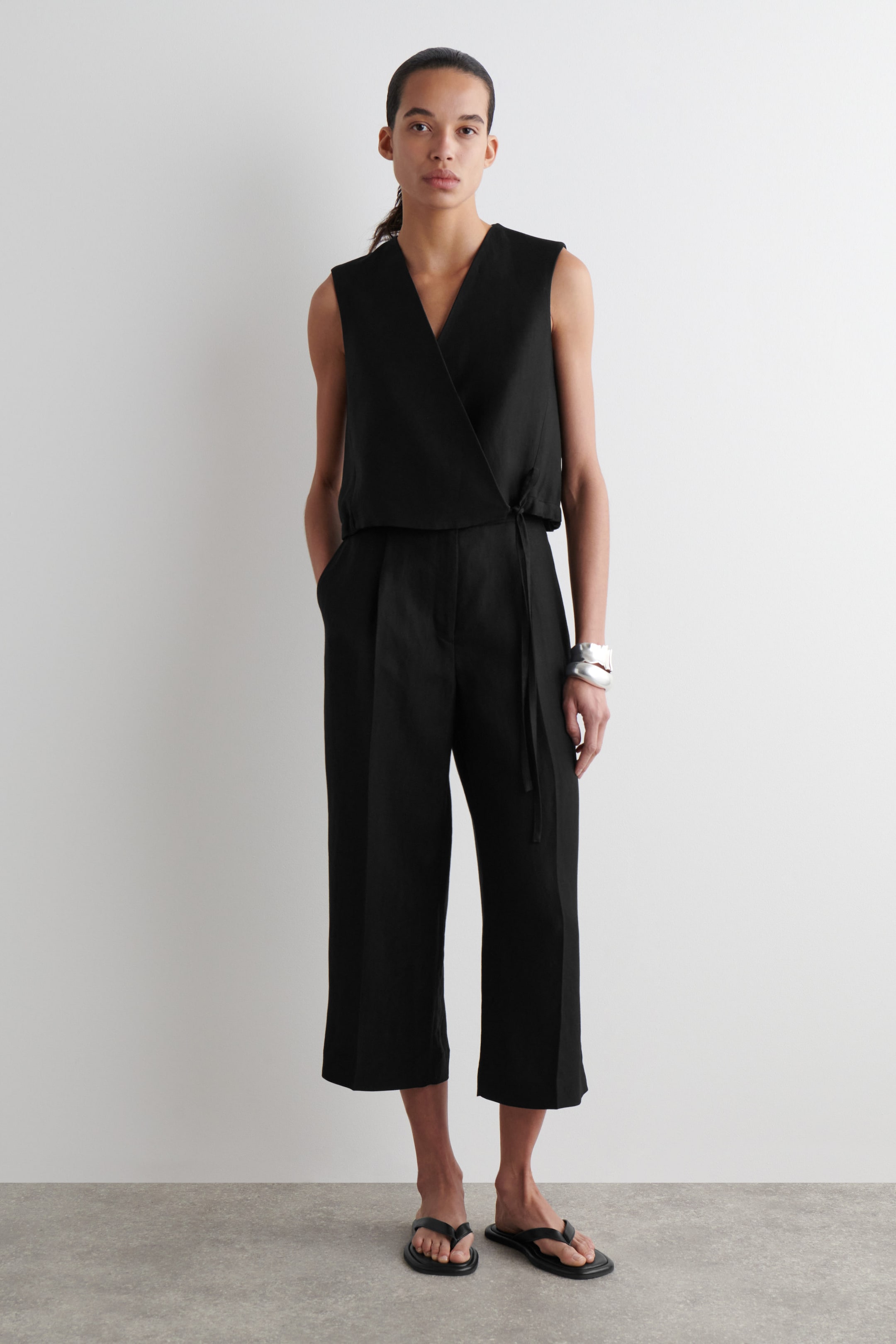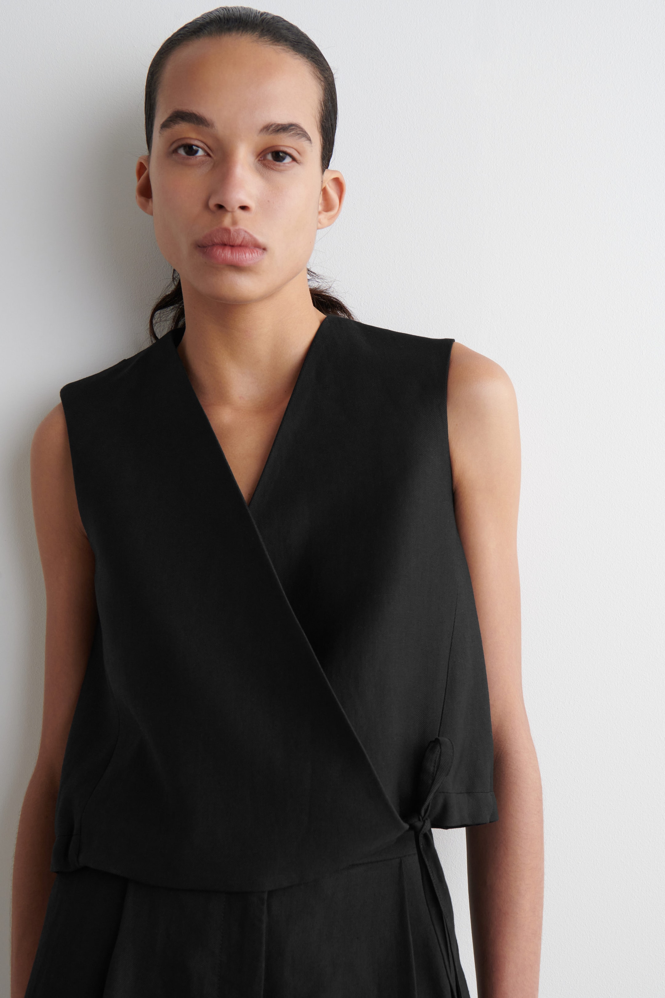 The womenswear team soften classic tailoring codes for Spring Summer 2025. This sophisticated vest is crafted from a lightweight linen blend and features a V-neckline and a wrap silhouette that ties at one side.