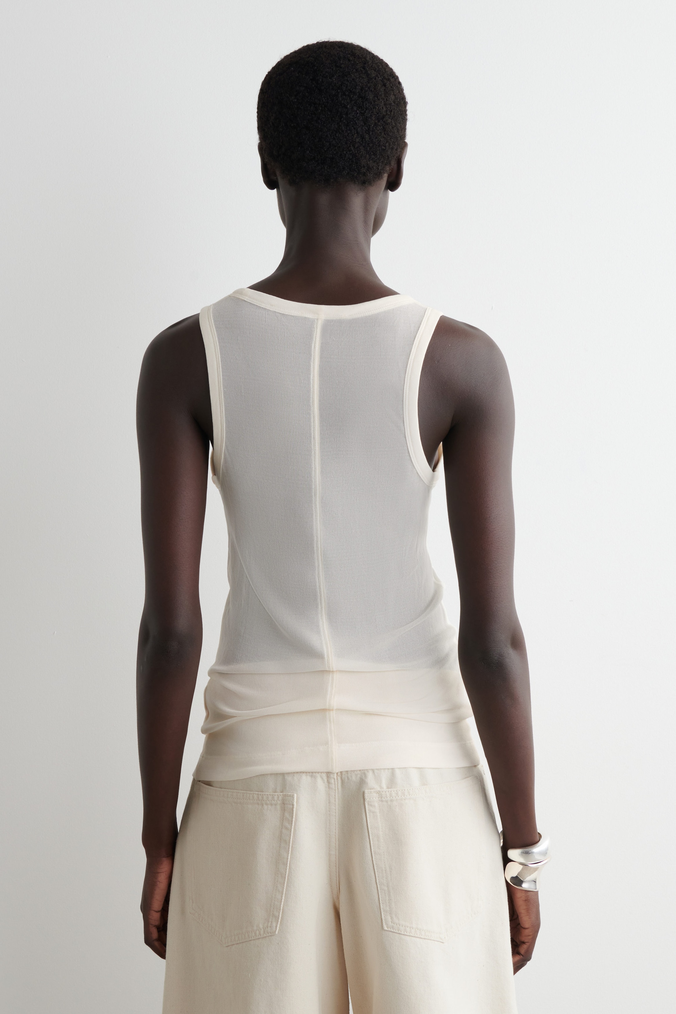 This season, the womenswear team present a refined take on the classic COS tank. It's crafted from ribbed mulberry-silk jersey, chosen for its luxuriously soft handle, and shaped with a rounded neckline. Style it alone or layered under shirts and blazers.