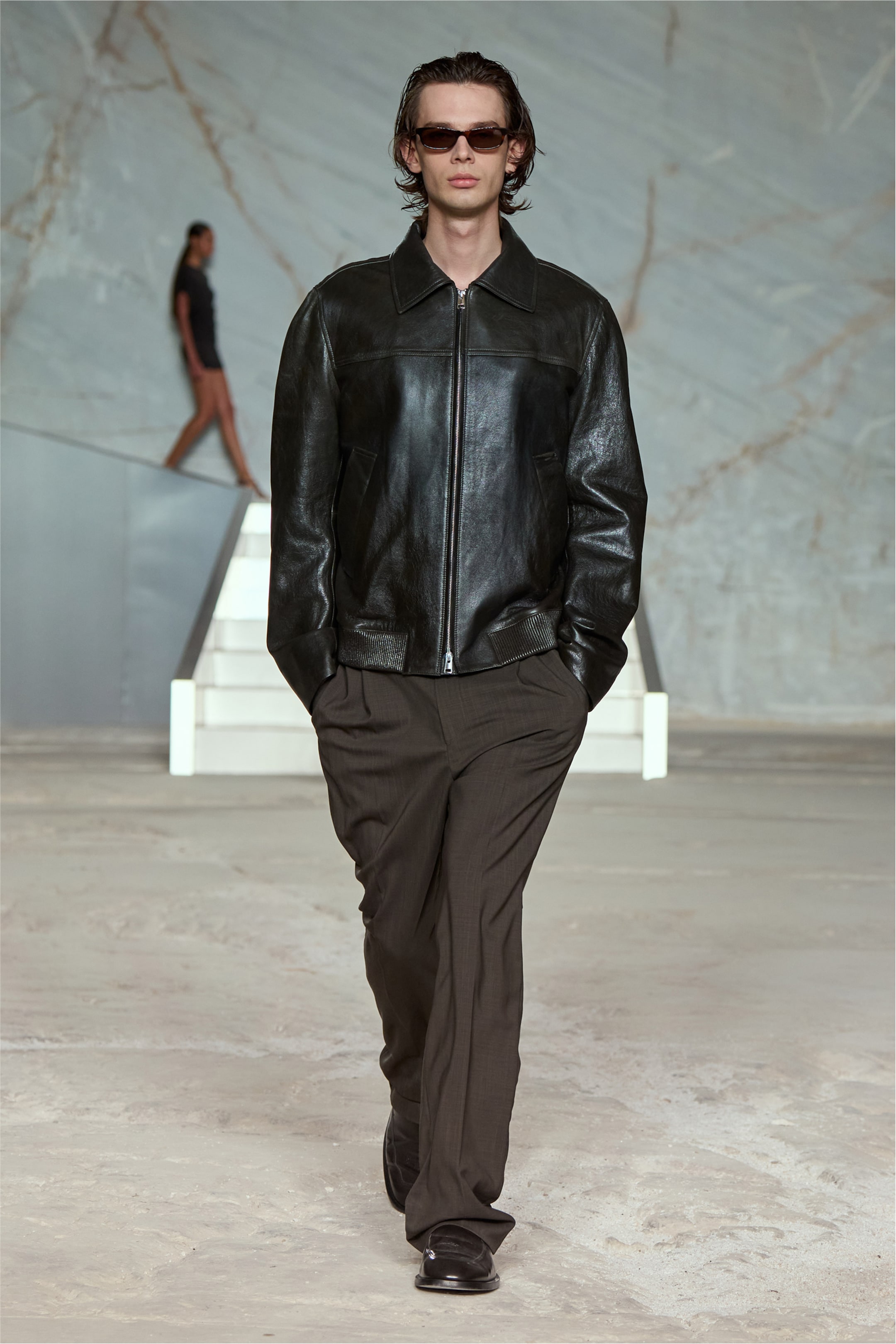 Everyday silhouettes rendered in luxurious materials embody the essence of the season. Pared-back styling showcased the rich quality of the leather; the jacket was worn nonchalantly over a simple white cotton T-shirt with fluid, wide-leg trousers. The eternal appeal of the men's leather is indisputable – pare it back with denim or style it with a suit to offset the formality of tailoring.