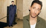 • Person in a burgundy coat and pants stands against a light-colored, textured wall, looking to the side.
