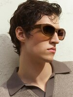 • Person wearing a black zip-up sweater, blue shirt, black pants, and brown shoes, standing against a plain white background.