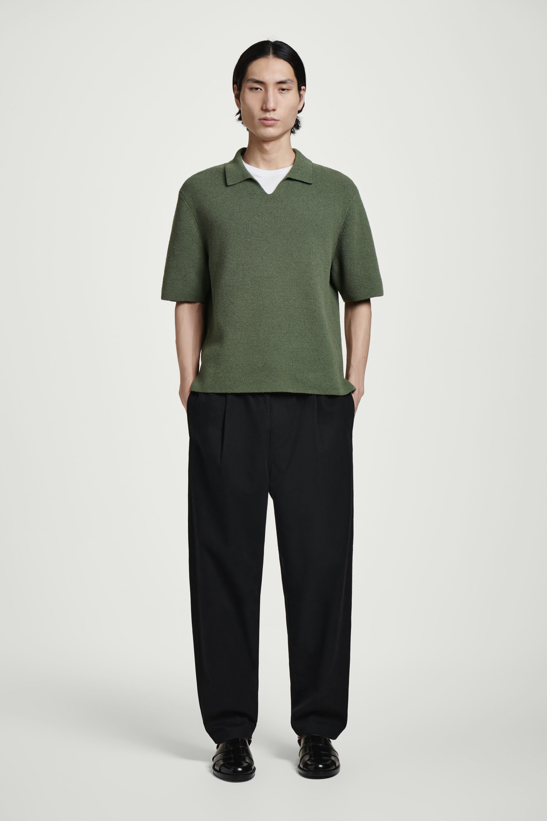 Channelling a laid-back appeal, this polo shirt is made from a tactile bouclé-knit cotton blend and has an effortless open collar. It's cut in a relaxed shape and comes in a versatile khaki shade.