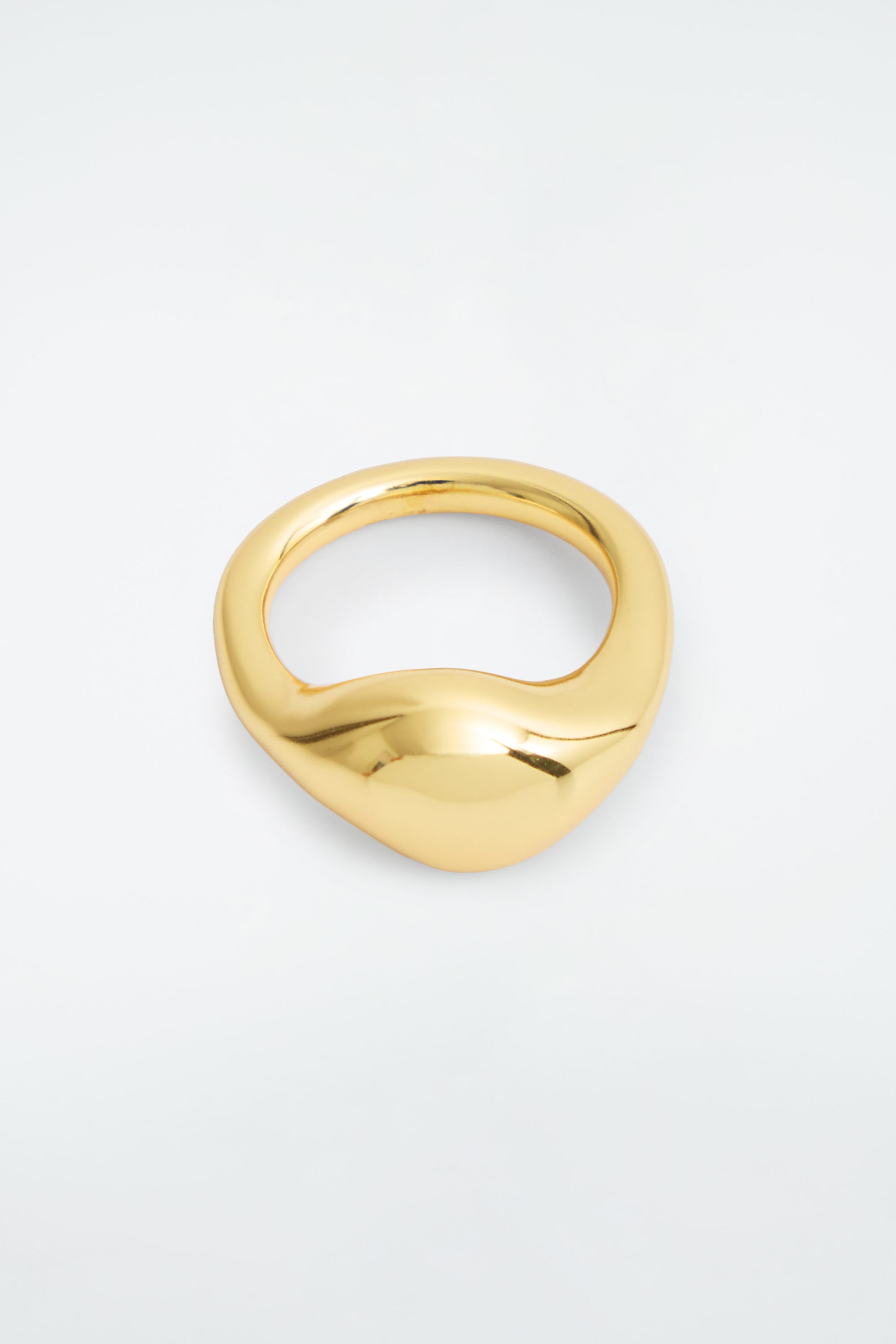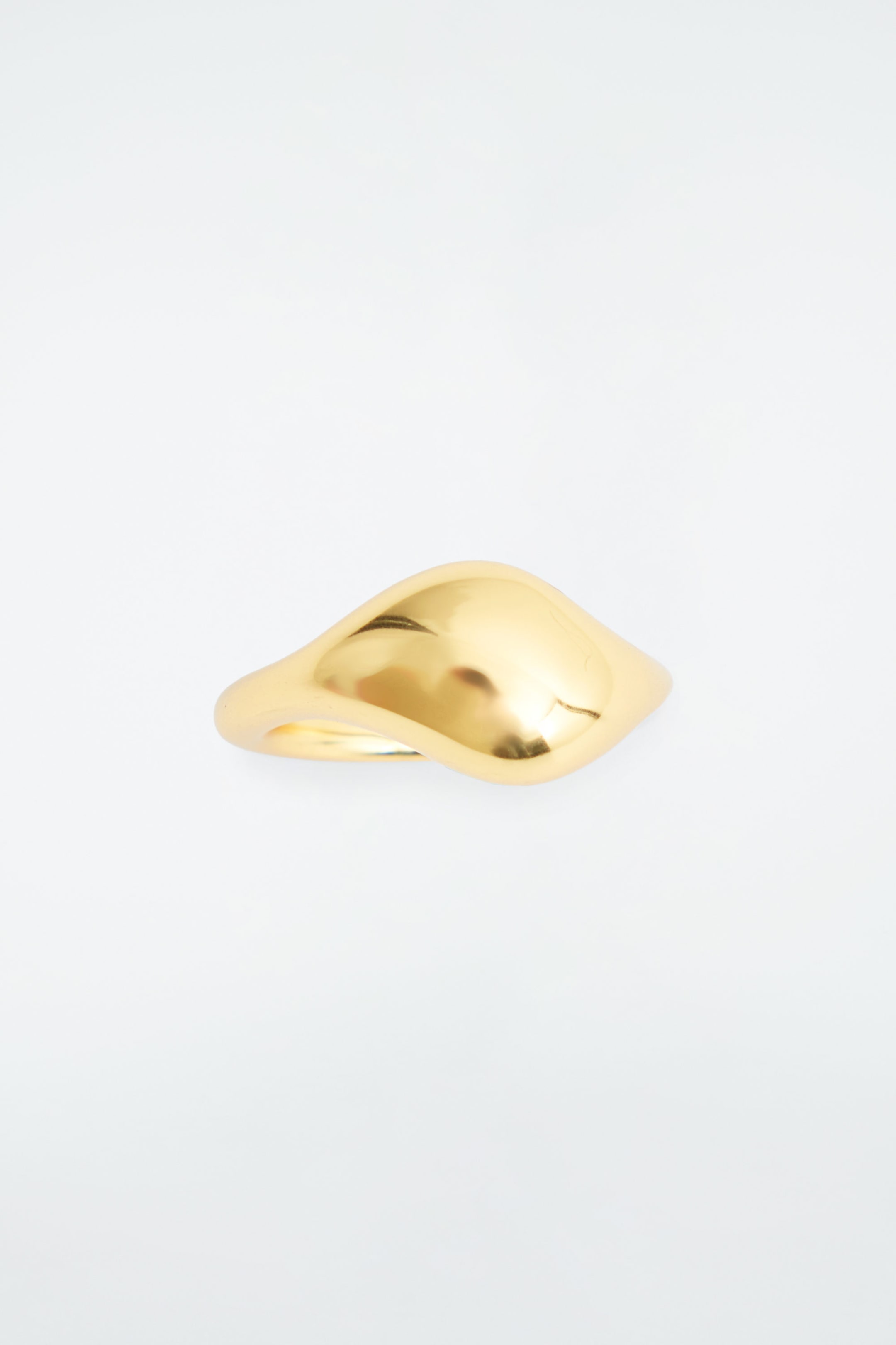 Sculpted in a chunky shape, this striking pinky ring evokes a water droplet wrapping around the finger. The polished gold coating promises an enduring shine.