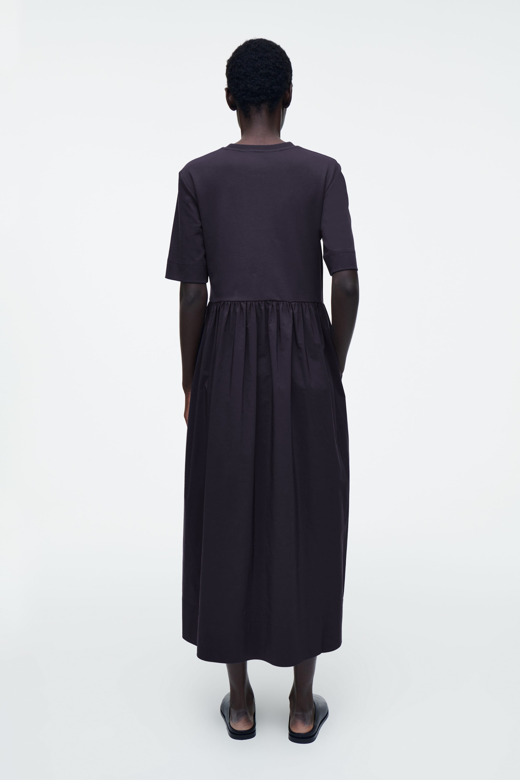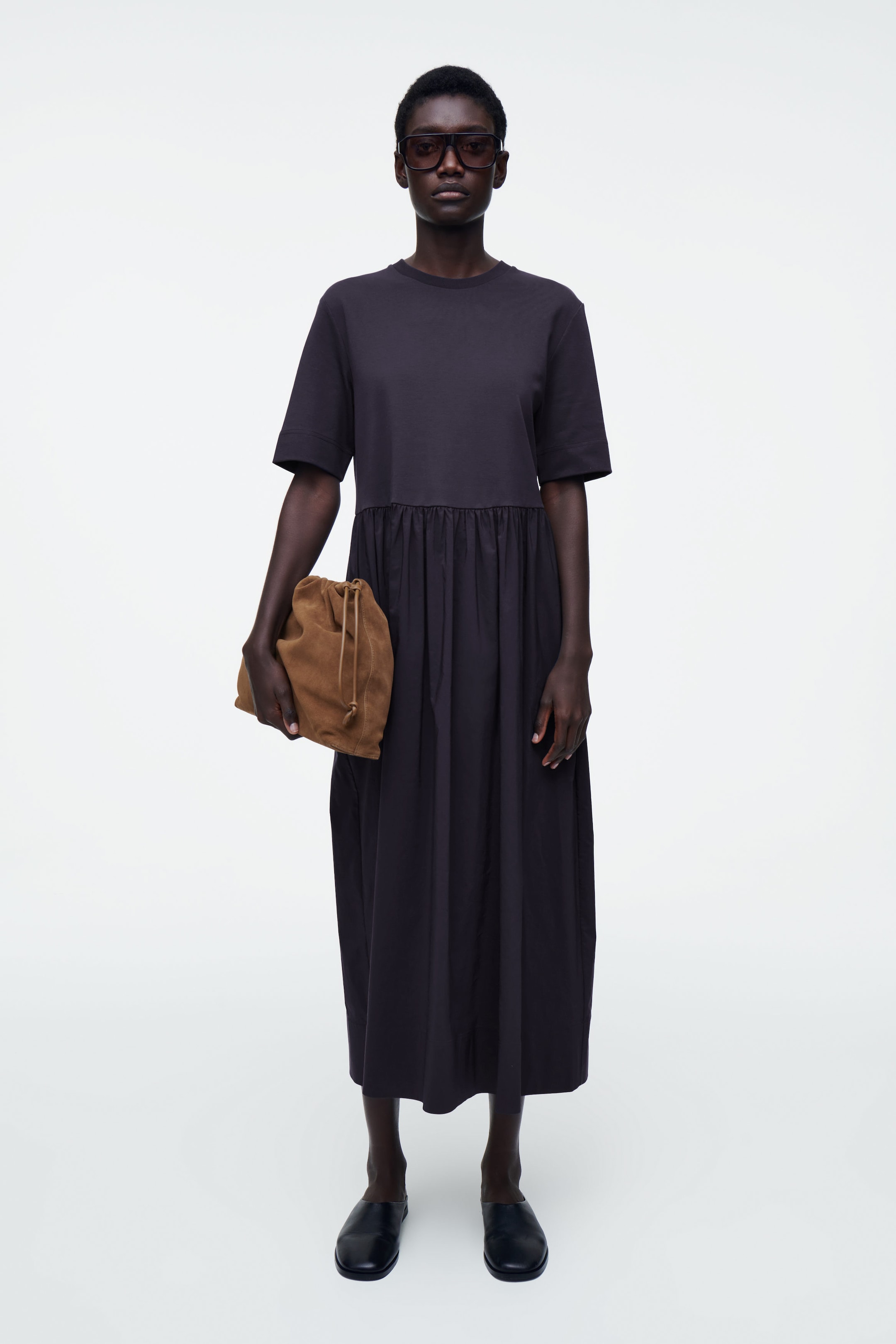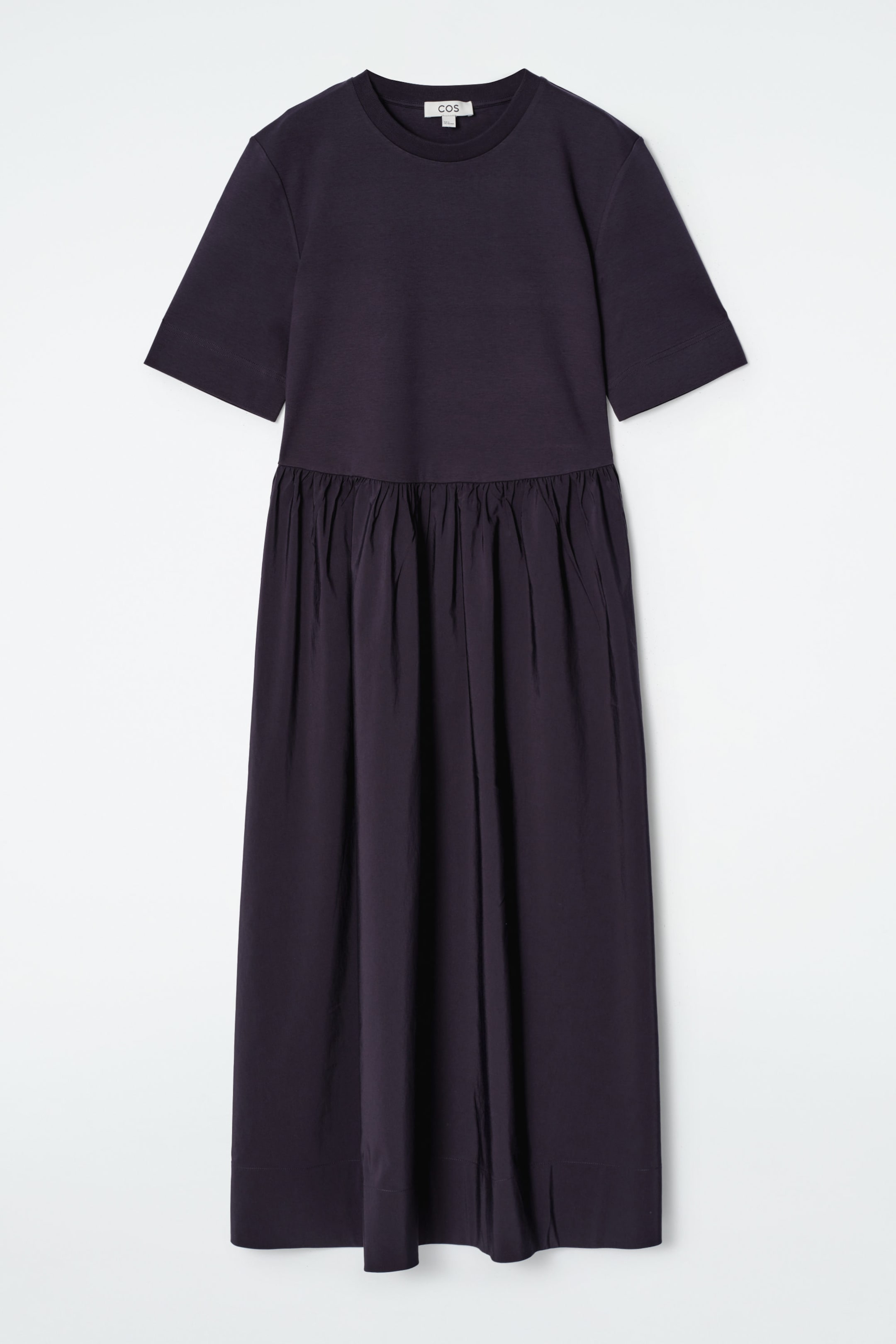 Offered in a classic navy tone, this dress is made from panels of contrasting fabrics – the top is made from cotton-jersey, while the skirt is woven from cotton-blend poplin. Gathering at the waistline creates movement through the hem