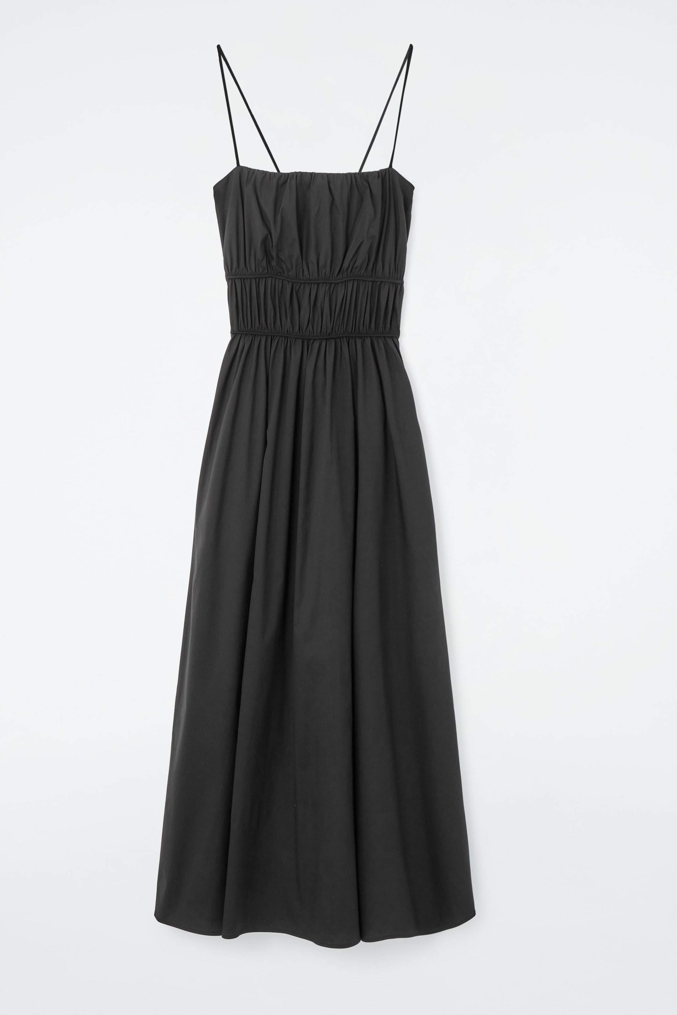 This season, the COS womenswear team experiments with ruching techniques to enhance simple silhouettes. Reminiscent of summer days, this dress is styled with a stretchy gathered bodice, slender straps and an open V-back with tie detailing. The skirt billows from the waist while maintaining its delicate form, and pockets are subtly slotted in the side seams.