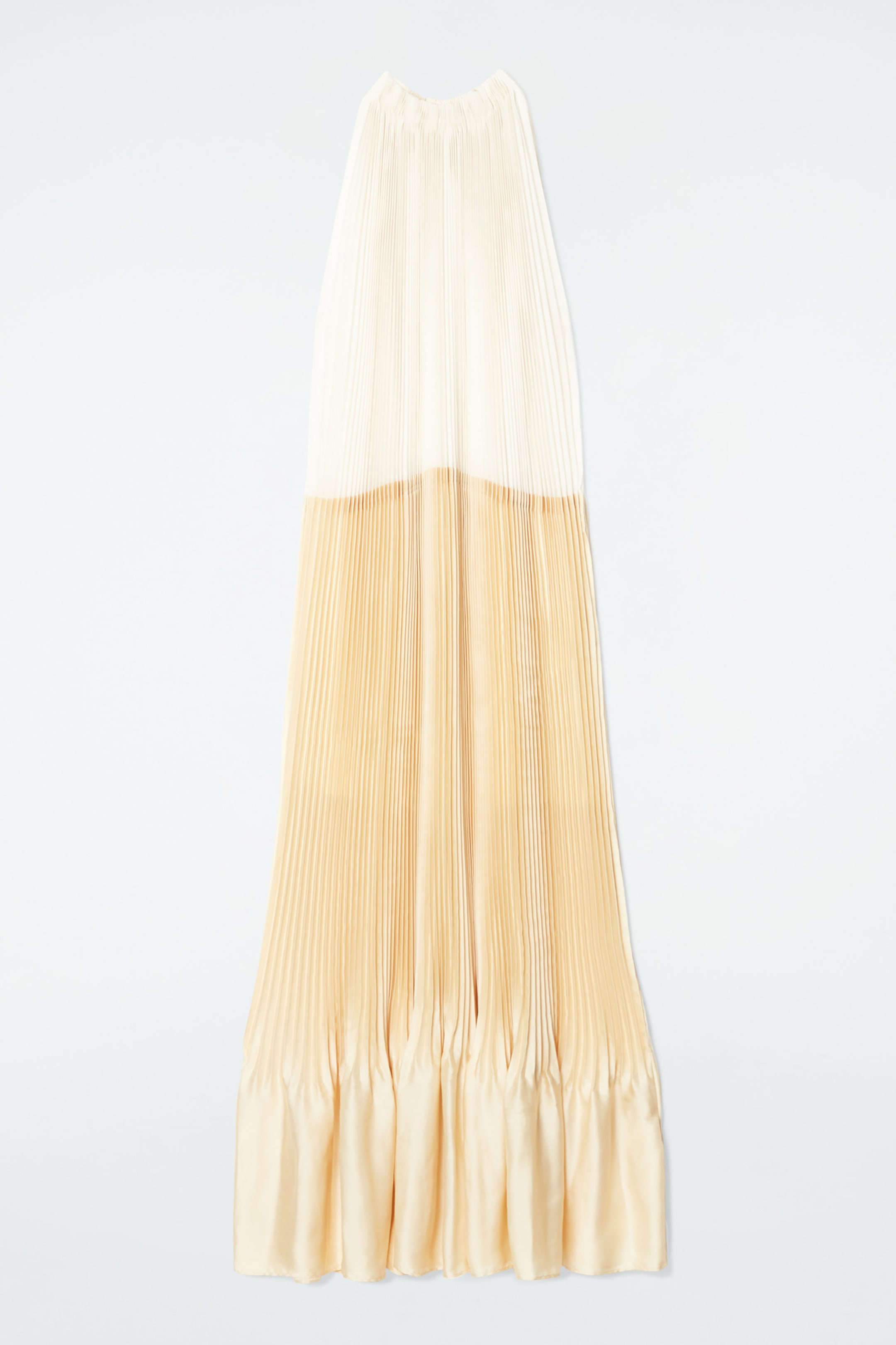 Offered in a rich champagne hue with a buttermilk hem, this modern maxi dress will bring a sense of occasion to summer events. It's cut with sharp accordion pleats that lend texture and volume, and designed with a ruffled halterneck that's finished with laser-cut edges. Style it with heels or a pair of ballet flats.