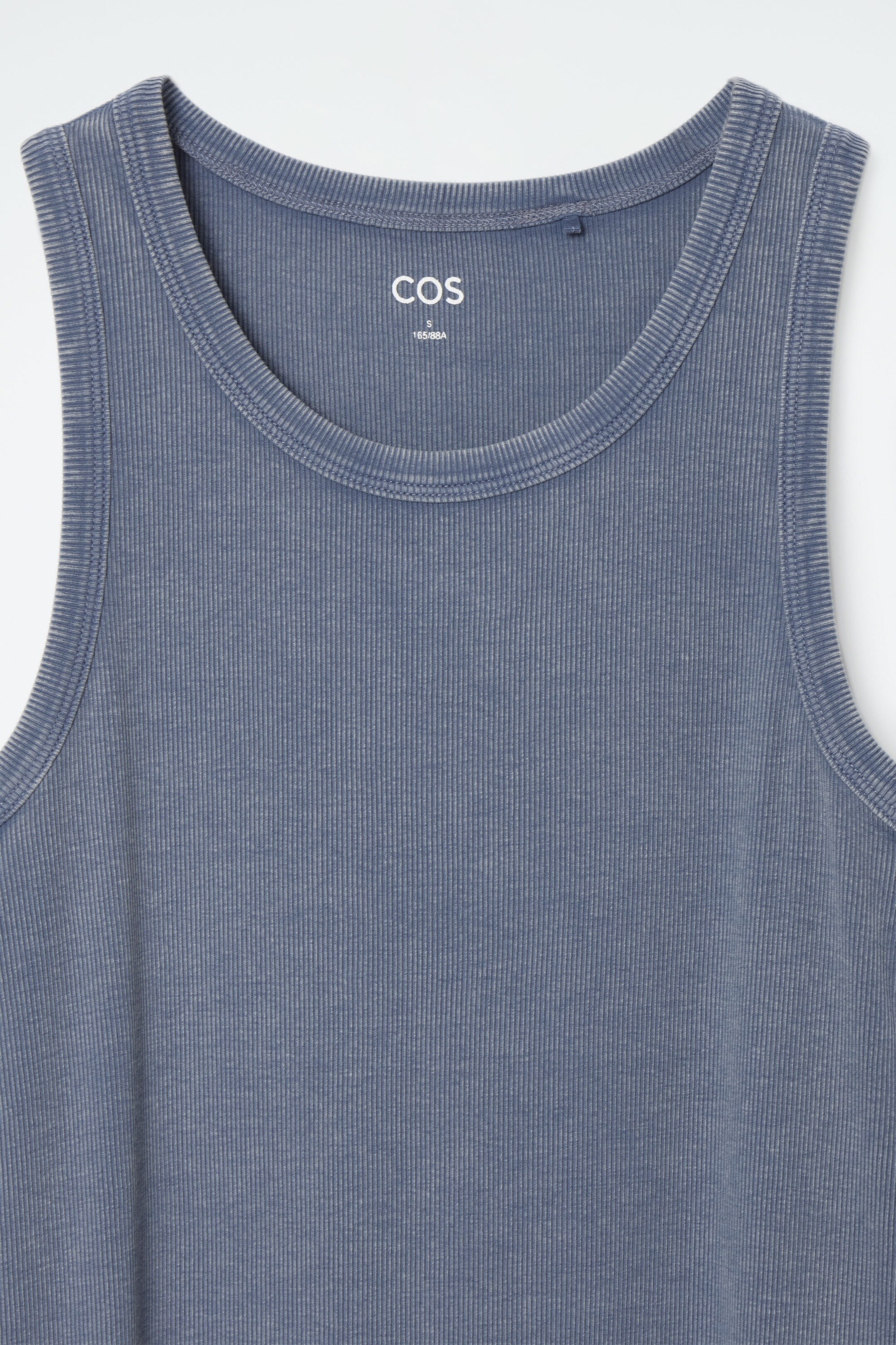This sleeveless dress is a versatile piece for the transitional months. Crafted from organic cotton with a hint of stretch, it comes in a steel-blue shade and has a rounded neckline and a form-fitting, slim shape.