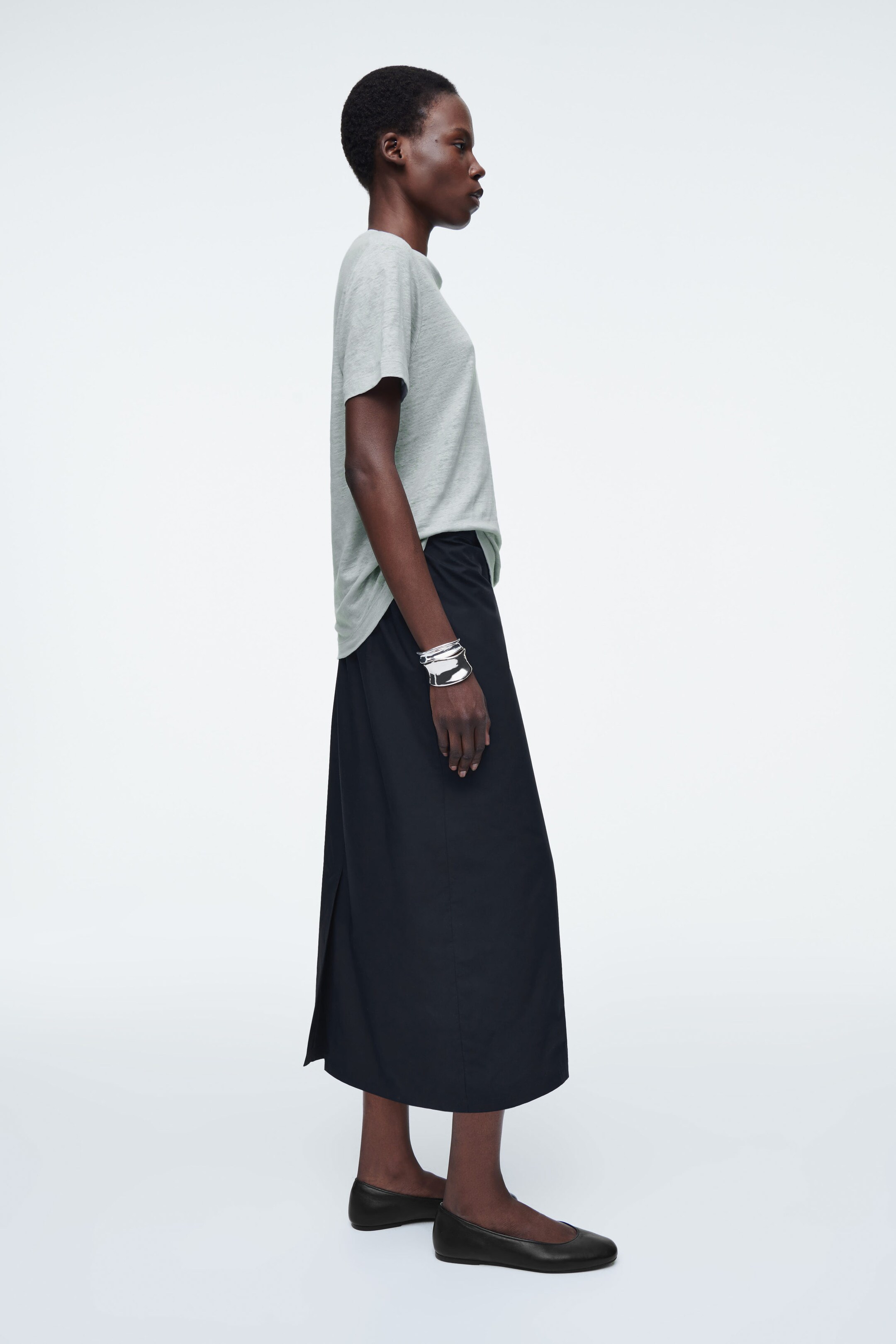 The COS womenswear team present an everyday icon, perfected. This refined T-shirt is crafted from 210gsm European Flax™ jersey, chosen for its natural breathability and soft handle. It's cut in a classic crew-neck shape and comes in a fresh dusty-blue tone.