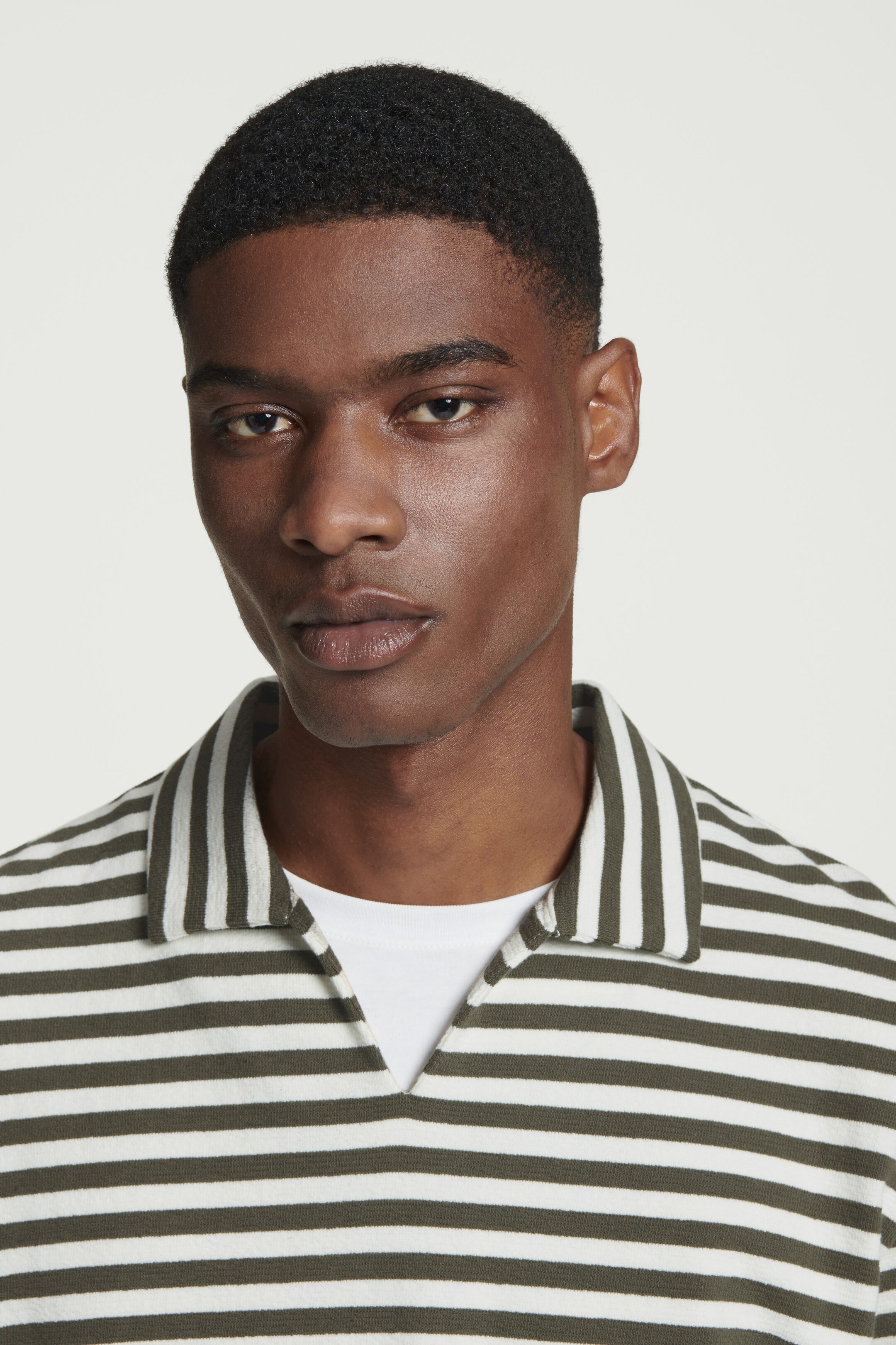 Designed for warmer days ahead, this polo shirt is made from supremely soft cotton-terry and features a laid-back open collar. The classic striped design is rendered in versatile khaki and ivory tones.