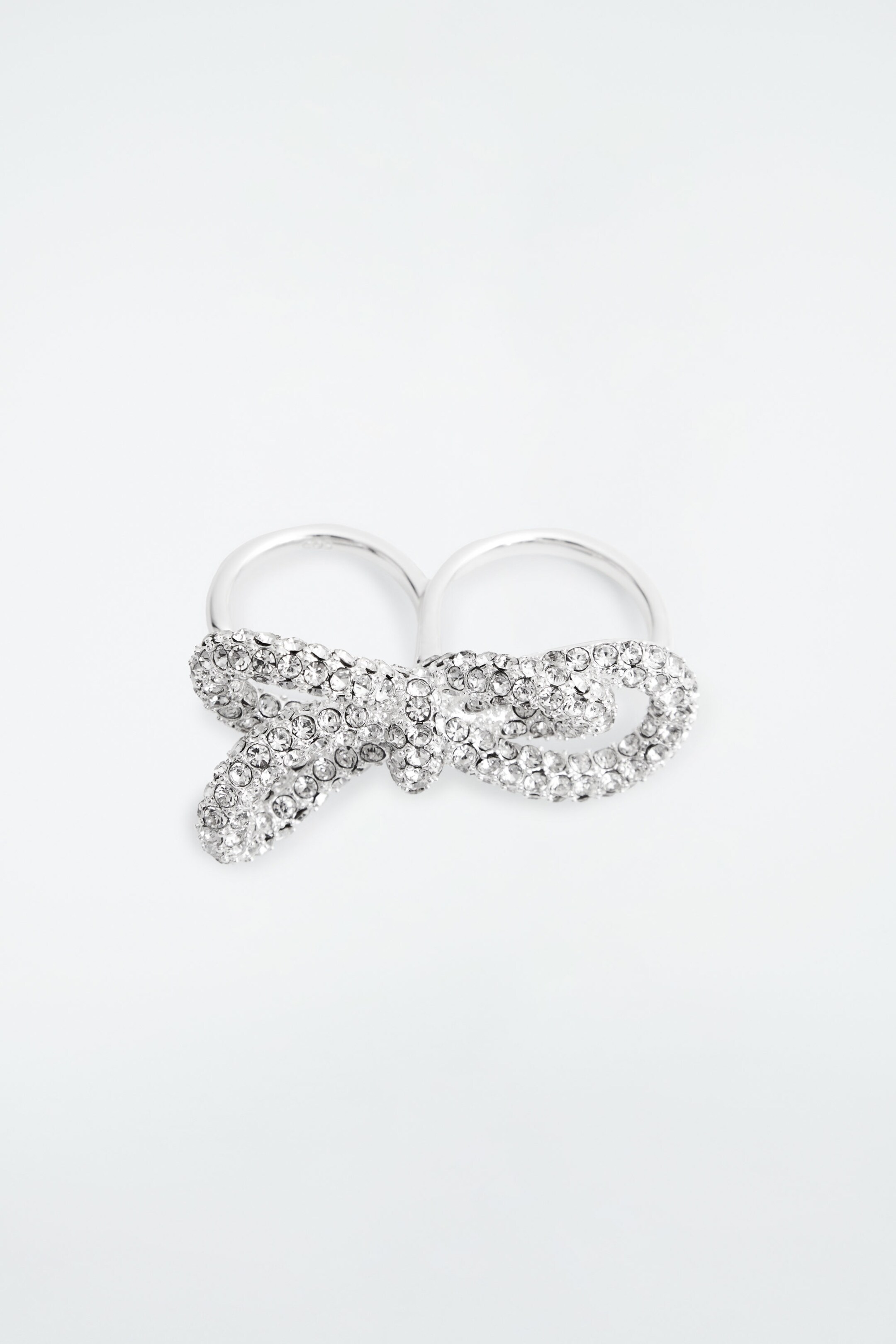 Conçue pour être portée sur deux doigts, cette bague singulière est confectionnée en laiton recyclé post-consommation et sculptée dans une forme de double nœud. Elle est décorée de rangées de cristaux qui scintillent merveilleusement à la lumière, ce qui en fait un accessoire parfait pour la saison des fêtes.