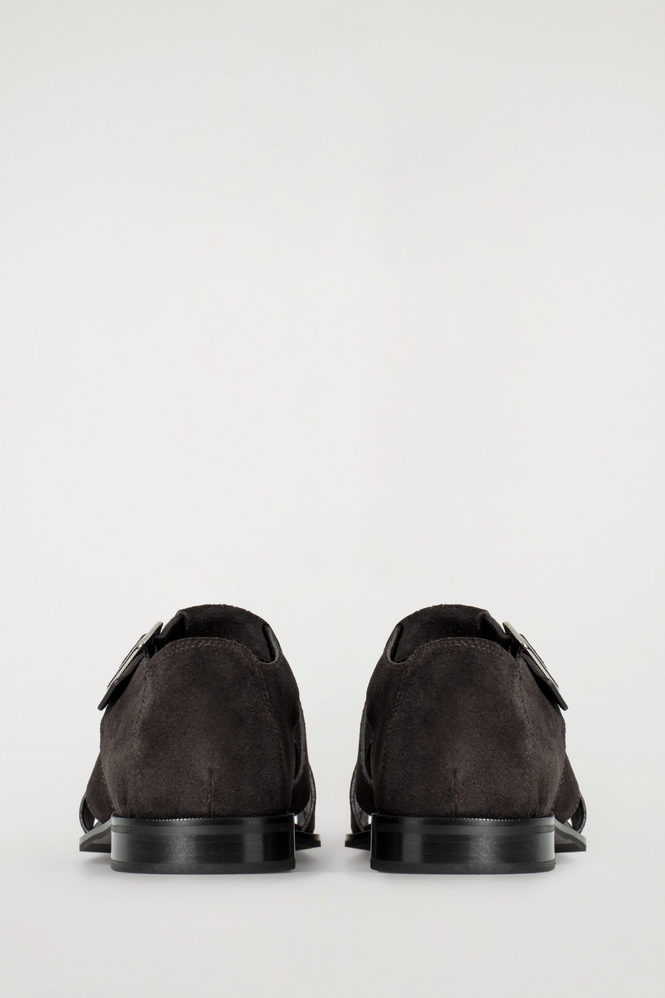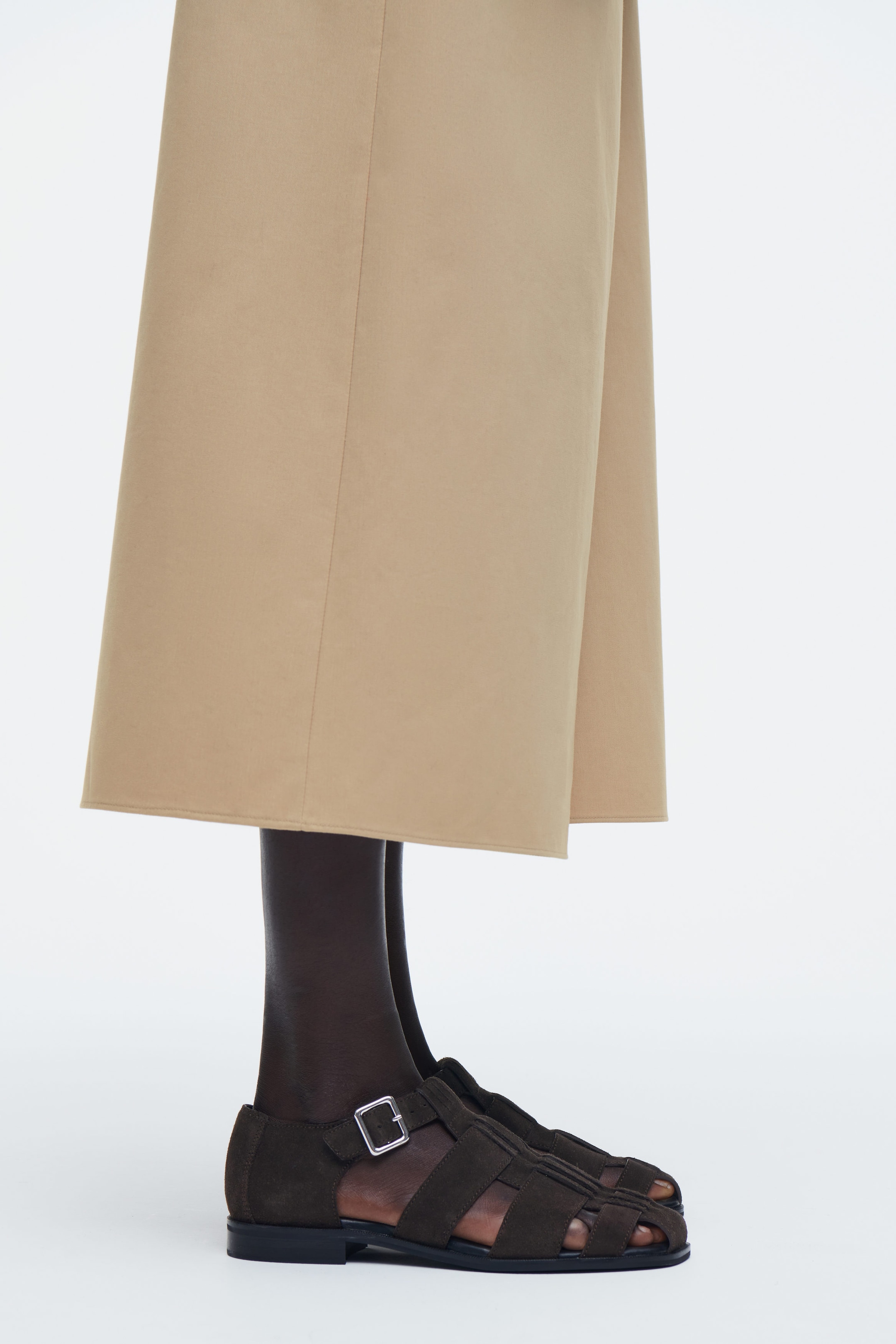 Cette saison, l'équipe du prêt-à-porter femme renouvelle une silhouette classique : la sandale spartiate. Confectionnées dans un cuir souple tanné sans chrome, ces chaussures plates et ouvertes présentent de larges brides entrelacées, un bout carré et un petit talon bloc.
