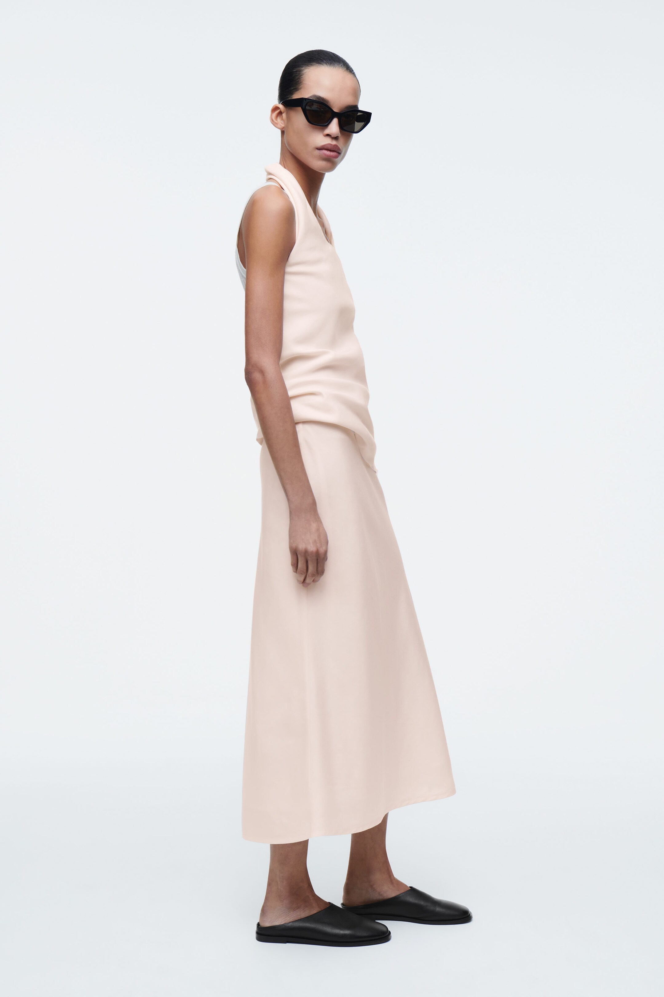 Prélude aux beaux jours, cette jupe midi coupée en biais est confectionnée dans un mélange léger de lyocell TENCEL ™ et de lin, idéal pour les journées douces. Déclinée dans un rose poudré, elle dessine une silhouette droite et colonne. Note de style : portez-la en total look avec le haut assorti.