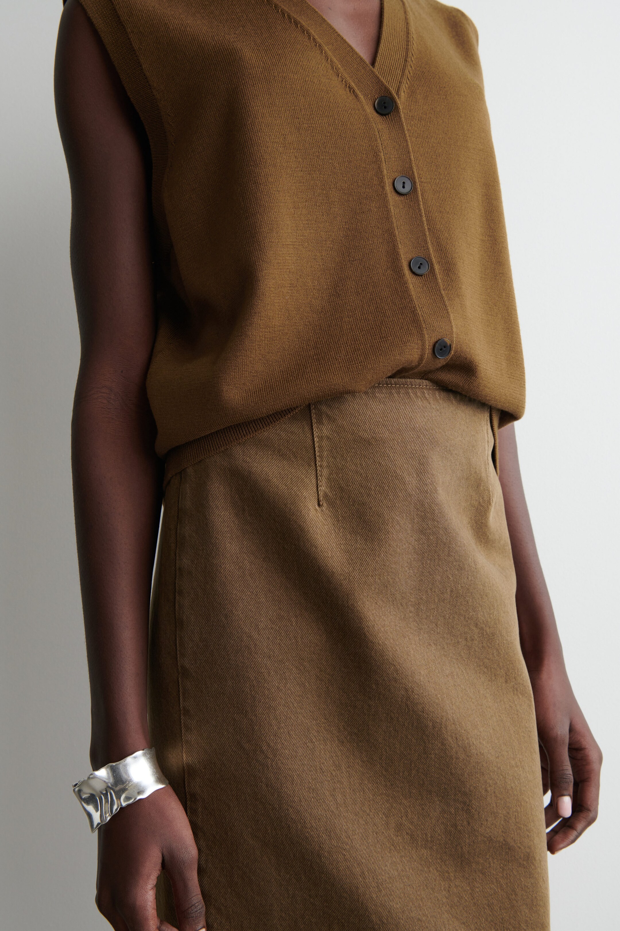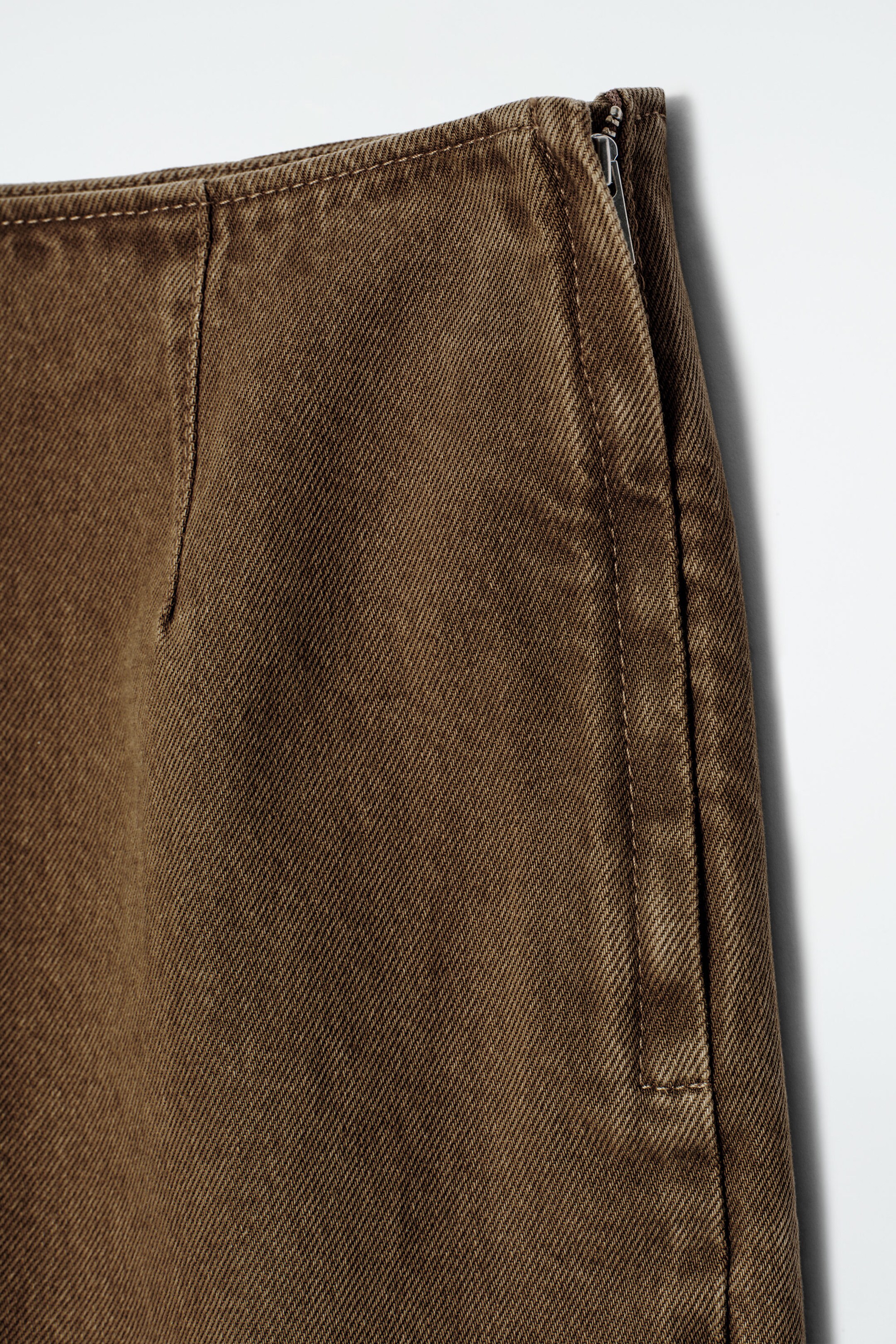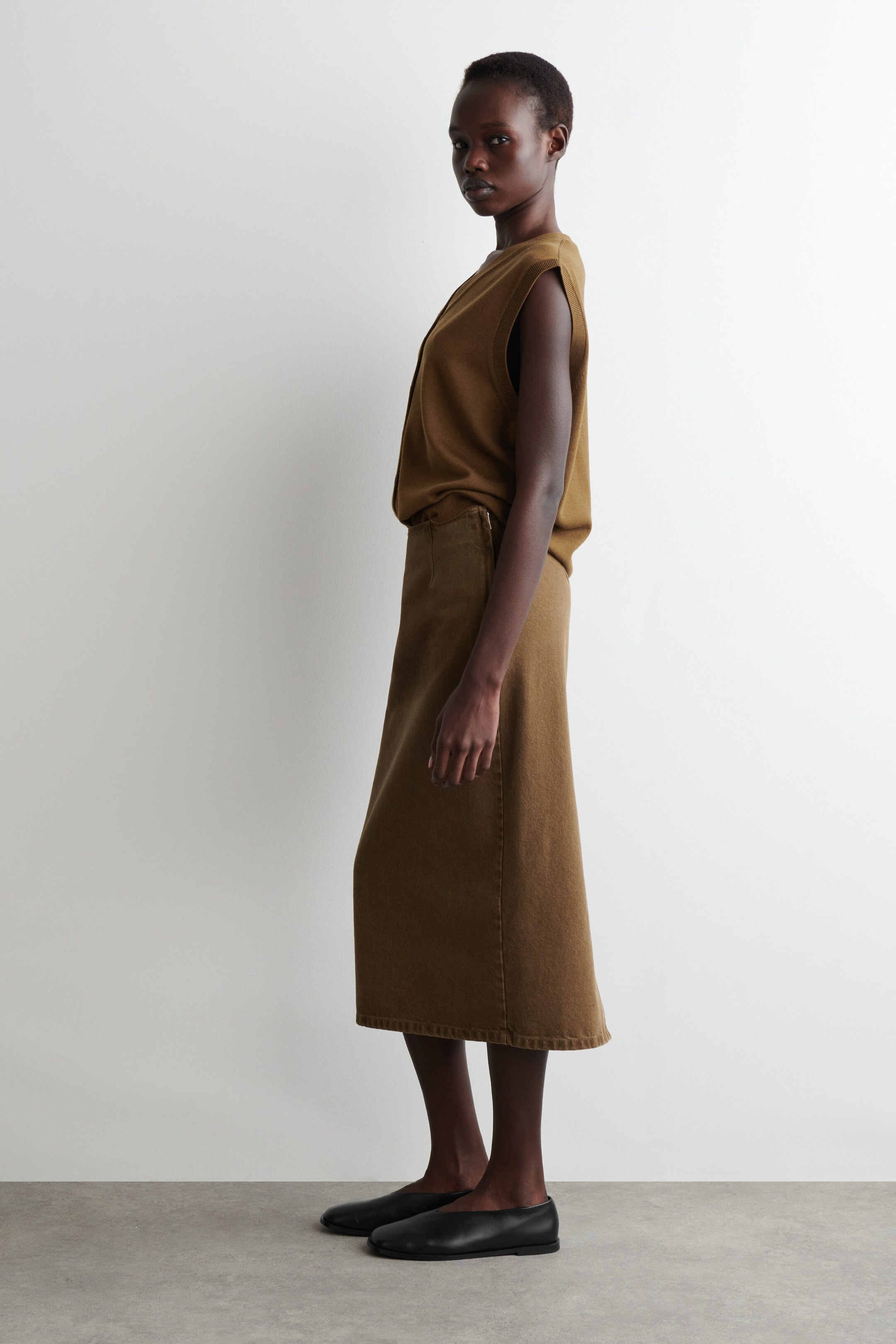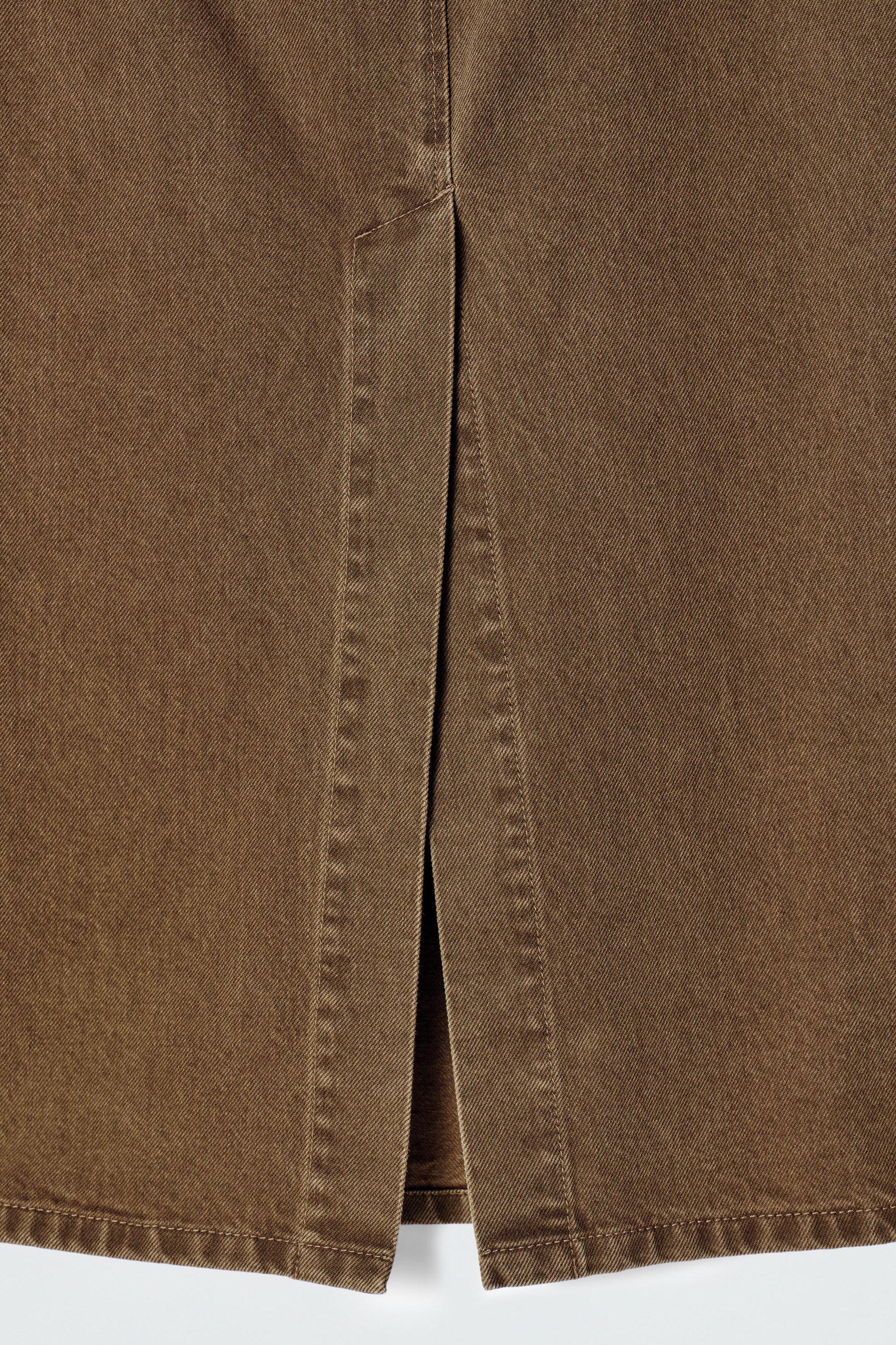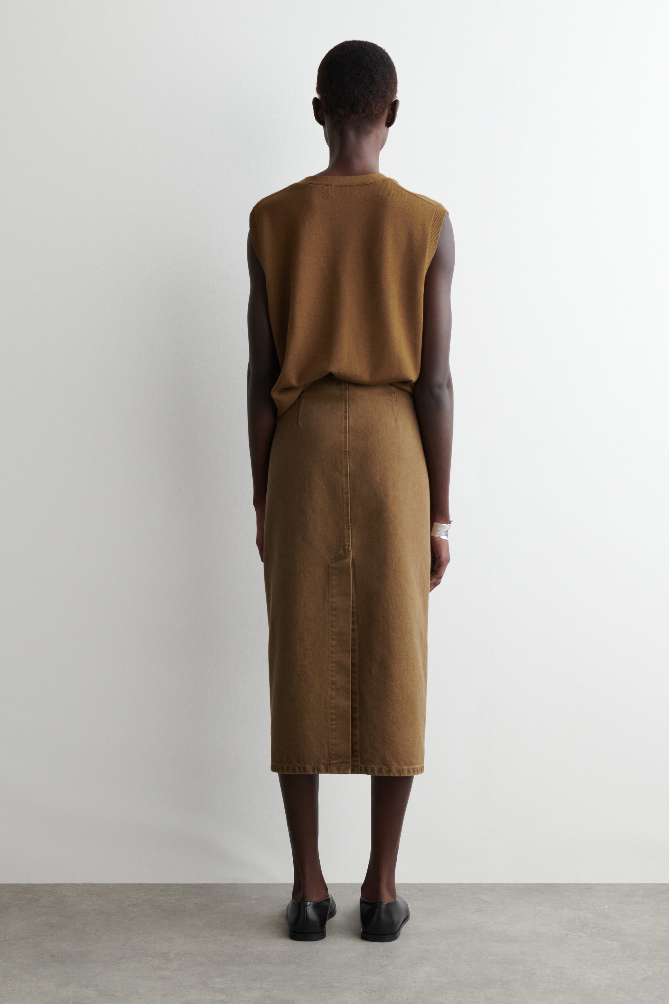 Cette saison, l'équipe de création du prêt-à-porter femme réinterprète le denim dans un style rappelant celui des années 2000. Proposée dans un délavage caramel intense, cette jupe midi est confectionnée en coton biologique et recyclé de qualité. Sa coupe droite est ornée de pinces à la taille et d'une fente au dos.