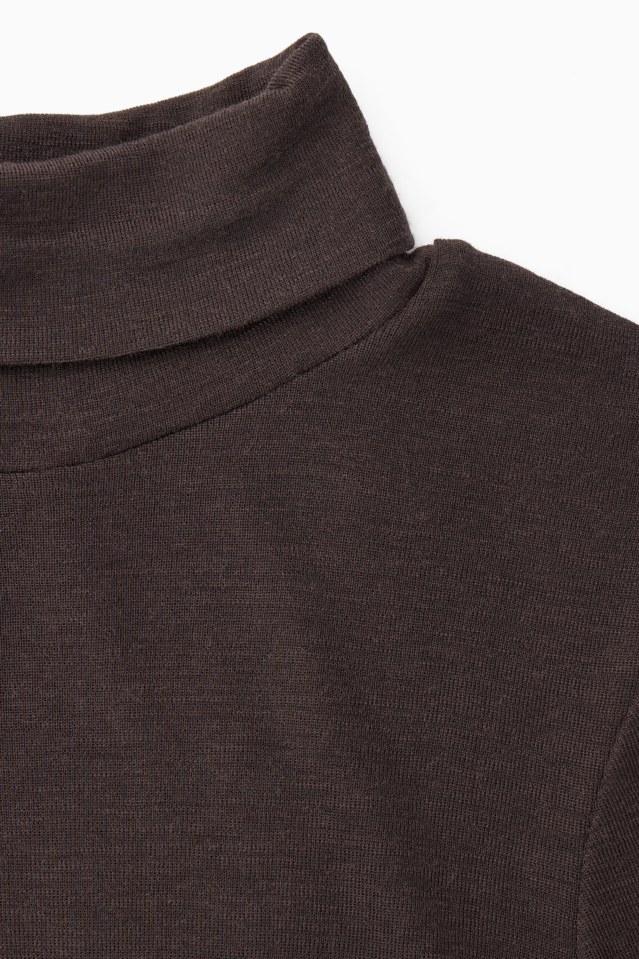 Proposé dans une riche teinte chocolat, ce haut classique est confectionné en pure laine mérinos et présente un col roulé haut. Il dessine une coupe ajustée épurée, idéale à superposer entre les saisons.