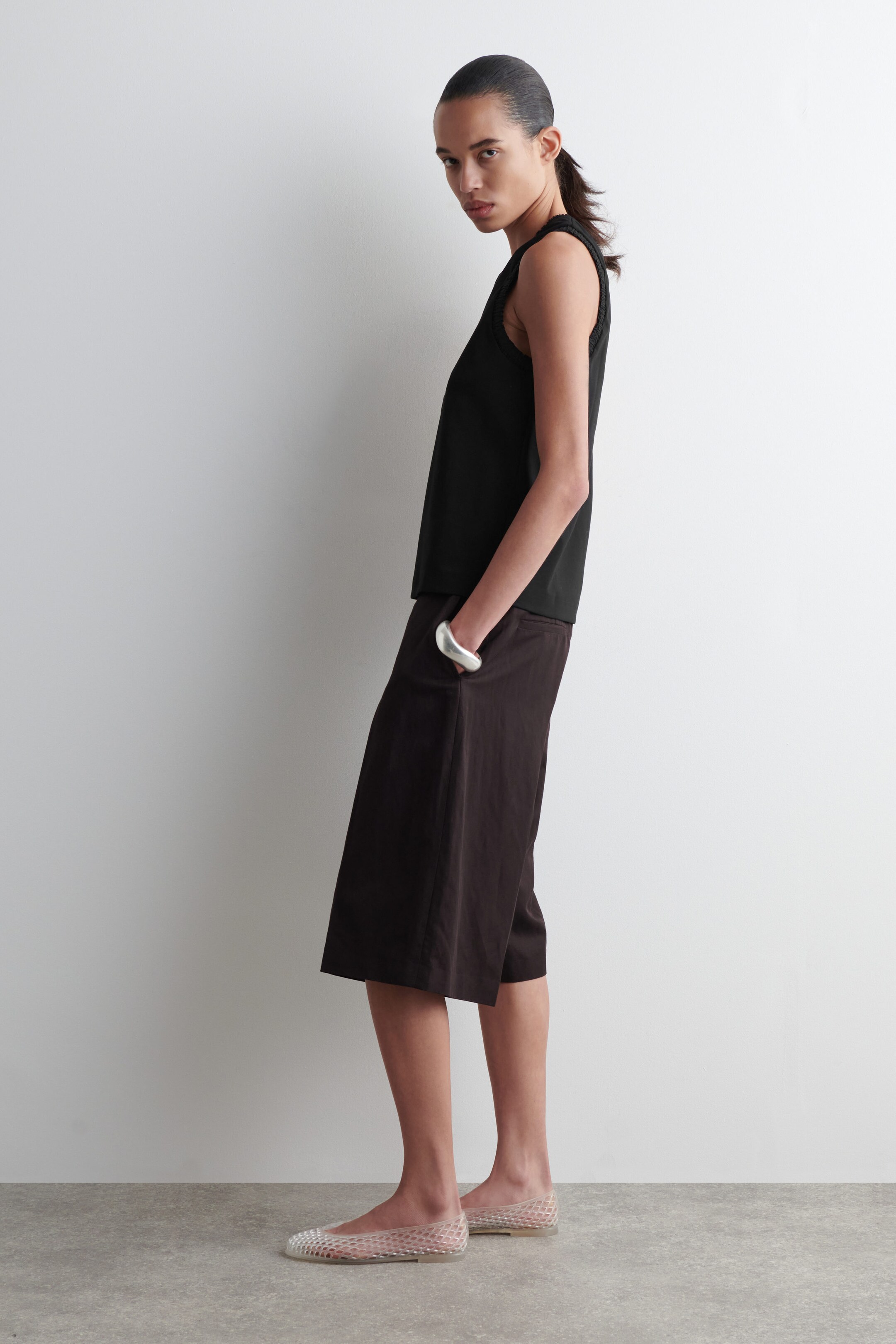 Confectionné en jersey de coton doux, ce débardeur raffiné présente des bords à fronces qui encadrent délicatement son encolure dégagée et ses manches, créant une silhouette originale et féminine. Ce haut est décliné dans un noir classique pour une polyvalence de tenues.